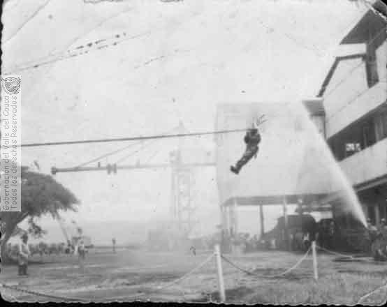 José Anibal cedeño, integrante del Cuerpo de Bomberos en práctica de entrenamiento. Zarzal, 1956.