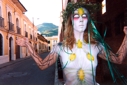 Exterior día. Plano medio de mujer con el torso pintado, corona de hojas y cintas verdes. Al fondo y en perspectiva se ve la arquitectura del centro de Cali y a la derecha el Centro Cultural del Municipio.Vale la pena apreciar el trabajo de pintura sobre el cuerpo que el mismo autor de la imagen realizó sobre la modelo.