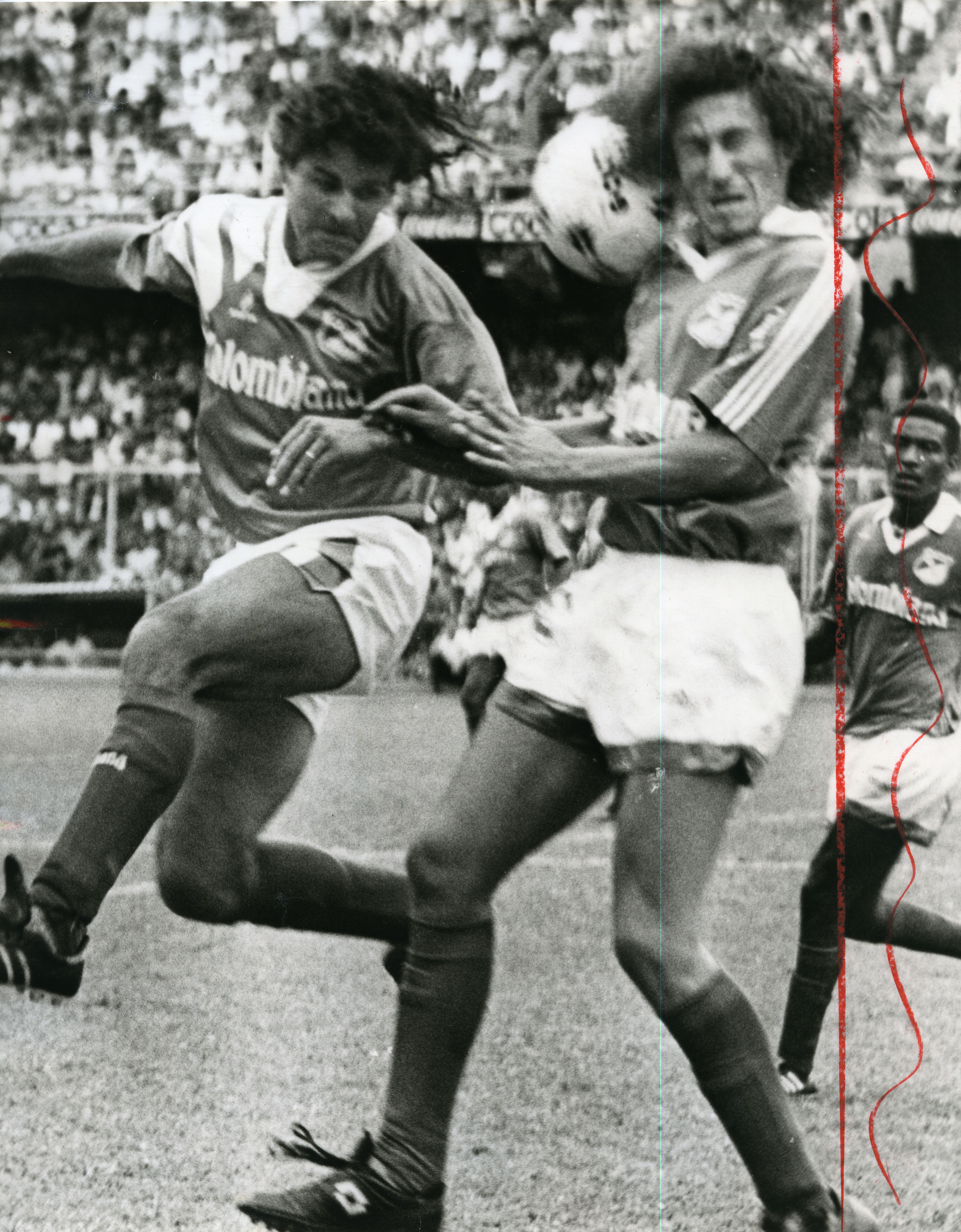 Partido de fútbol del Deportivo Cali en el Olímpico Pascual Guerrero. Se aprecia a dos jugadores en un duelo por el balón.