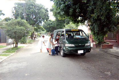 Niños bajando de colectivo de transporte escolar. Mujeres reciben los niños. Plano general.