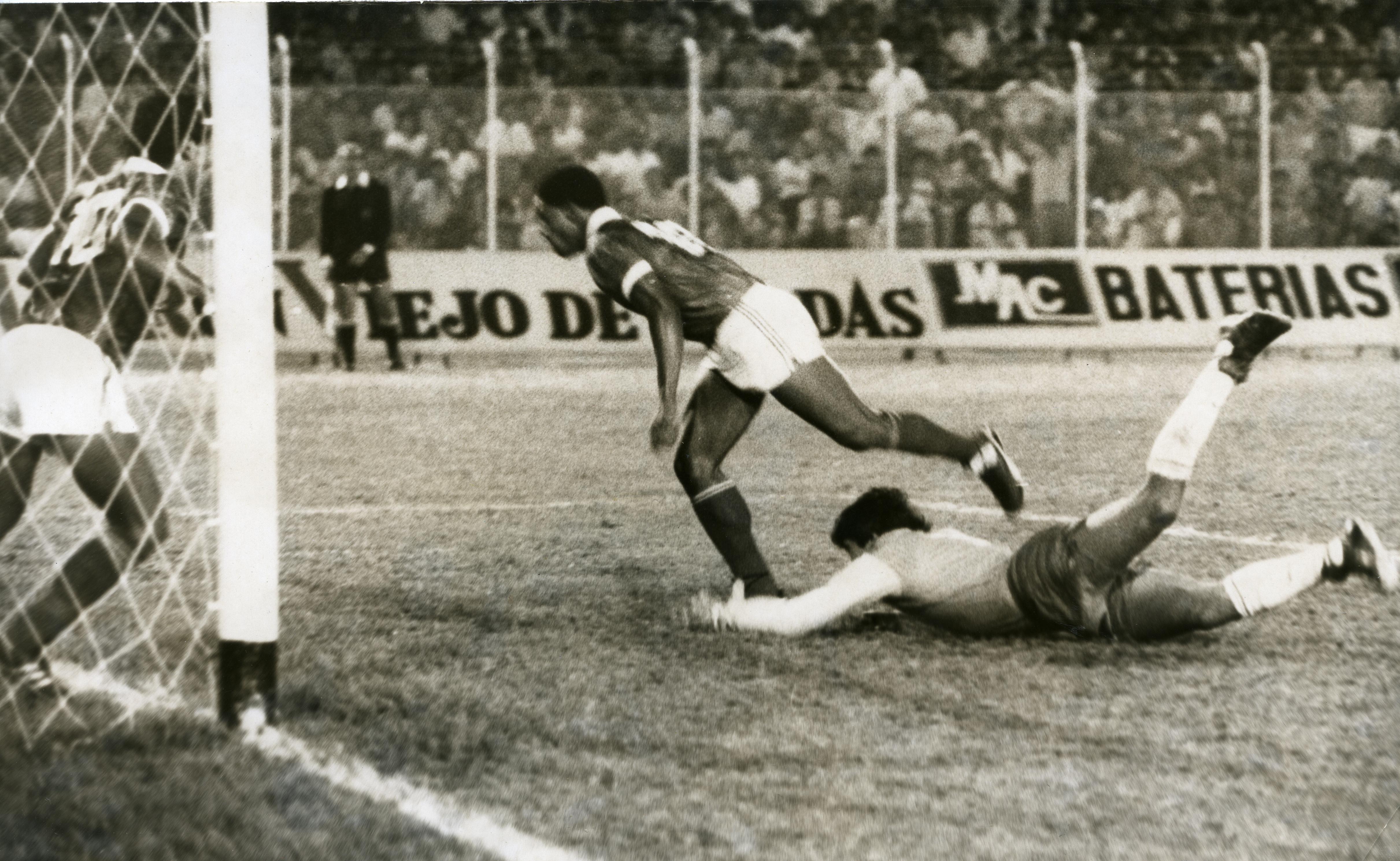 Partido de fútbol Copa Libertadores de América entre equipos Deportivo Cali y Oriente Petrolero. Observamos Jugador disputa balón con el arquero y la jugada termina en gol de Willy Rodríguez