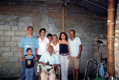 Plano medio conjunto. Interior día. Retrato familiar sobre fondo gris. Expresión alegre. Escenificación.