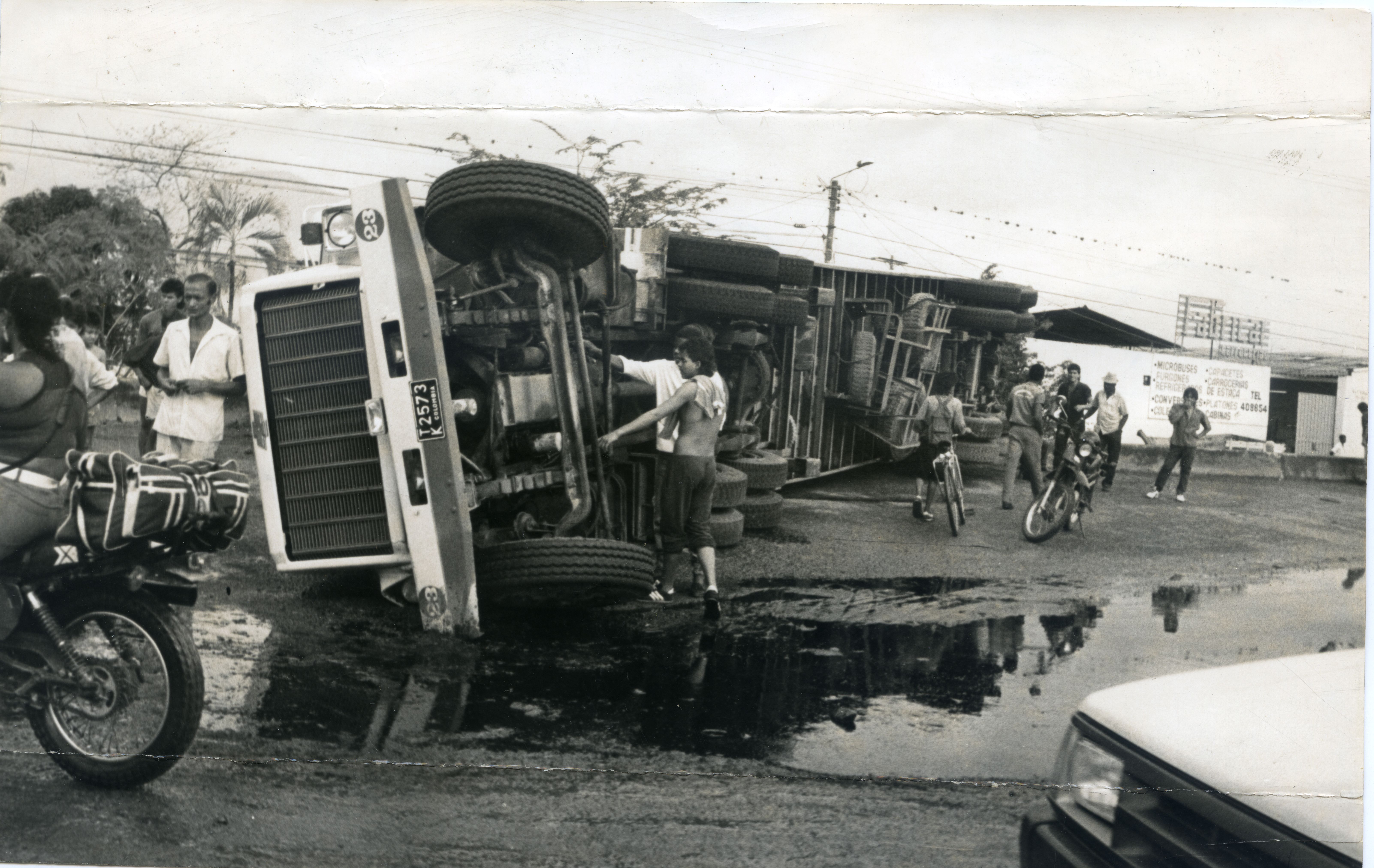 En la fotografía apreciamos un accidente en Paso del Comercio. Un vehículo de carga, de marca Chevrolet, con número de matrícula TK-2573, se volcó en la vía.