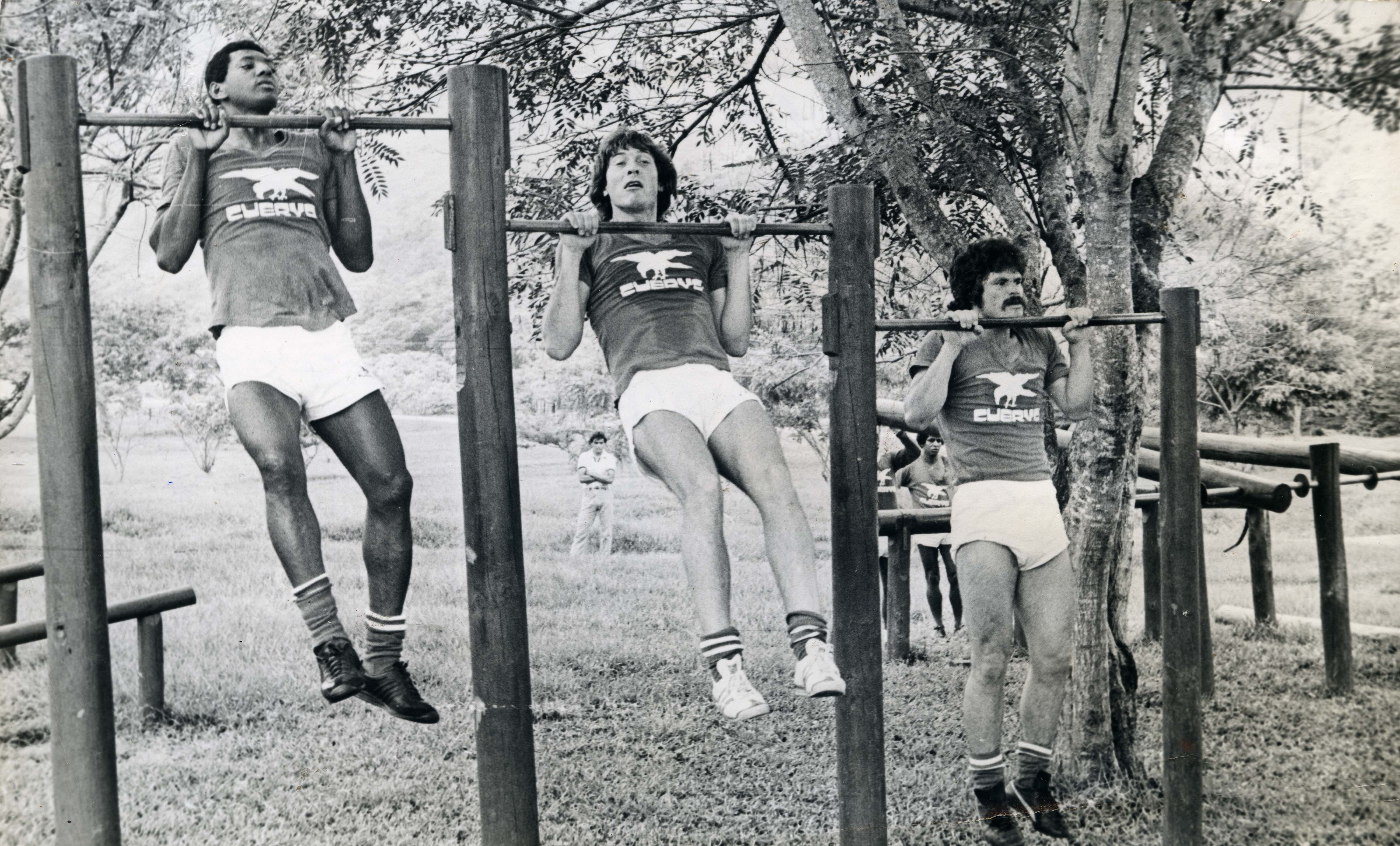 En el pie de foto dice lo siguiente: ejercicios básicos como hacer velas. Observamos practicando las velitas a los jugadores Luis Eduardo Reyes, Julio César Falcioni, y Heberth Armando Ríos
