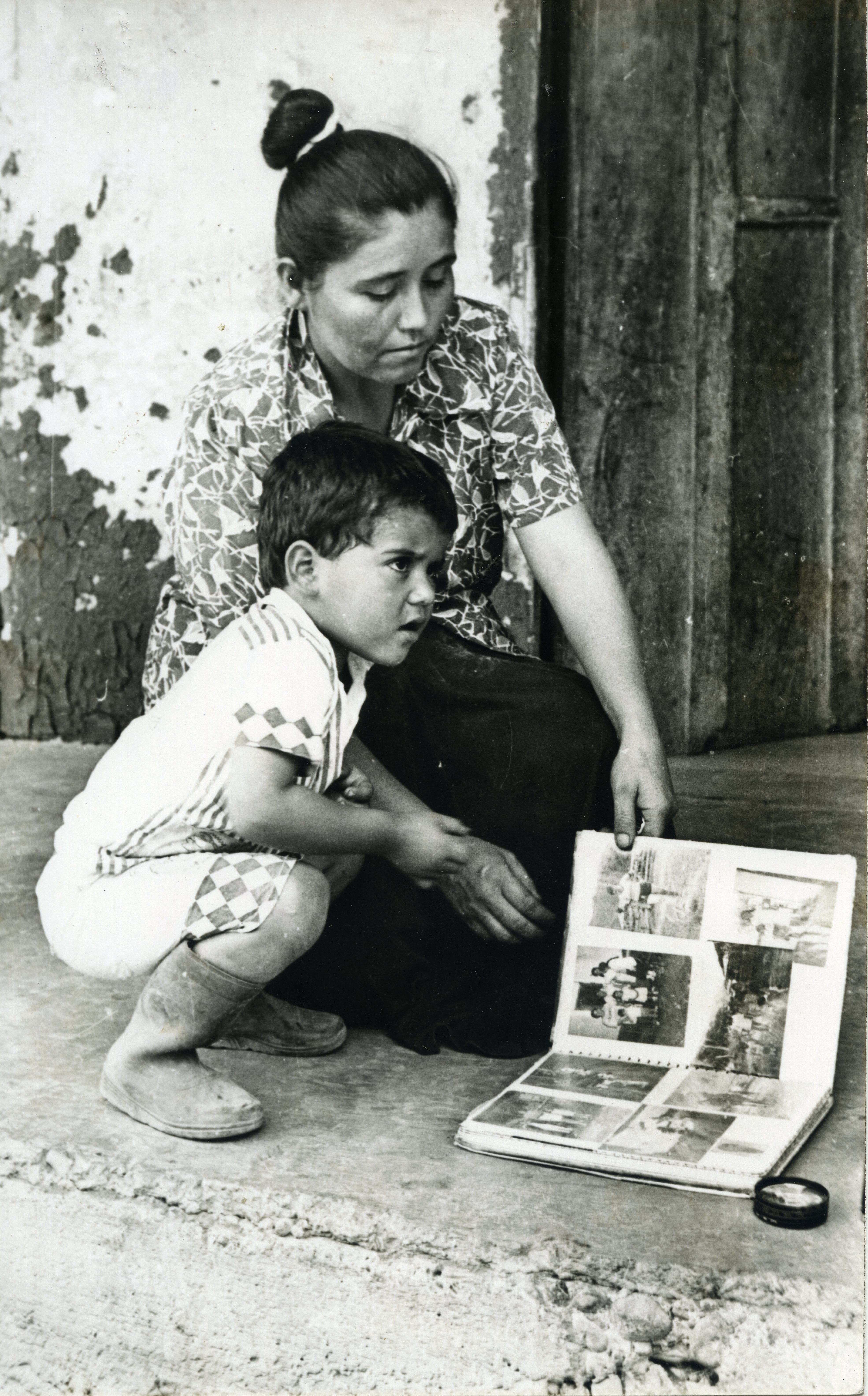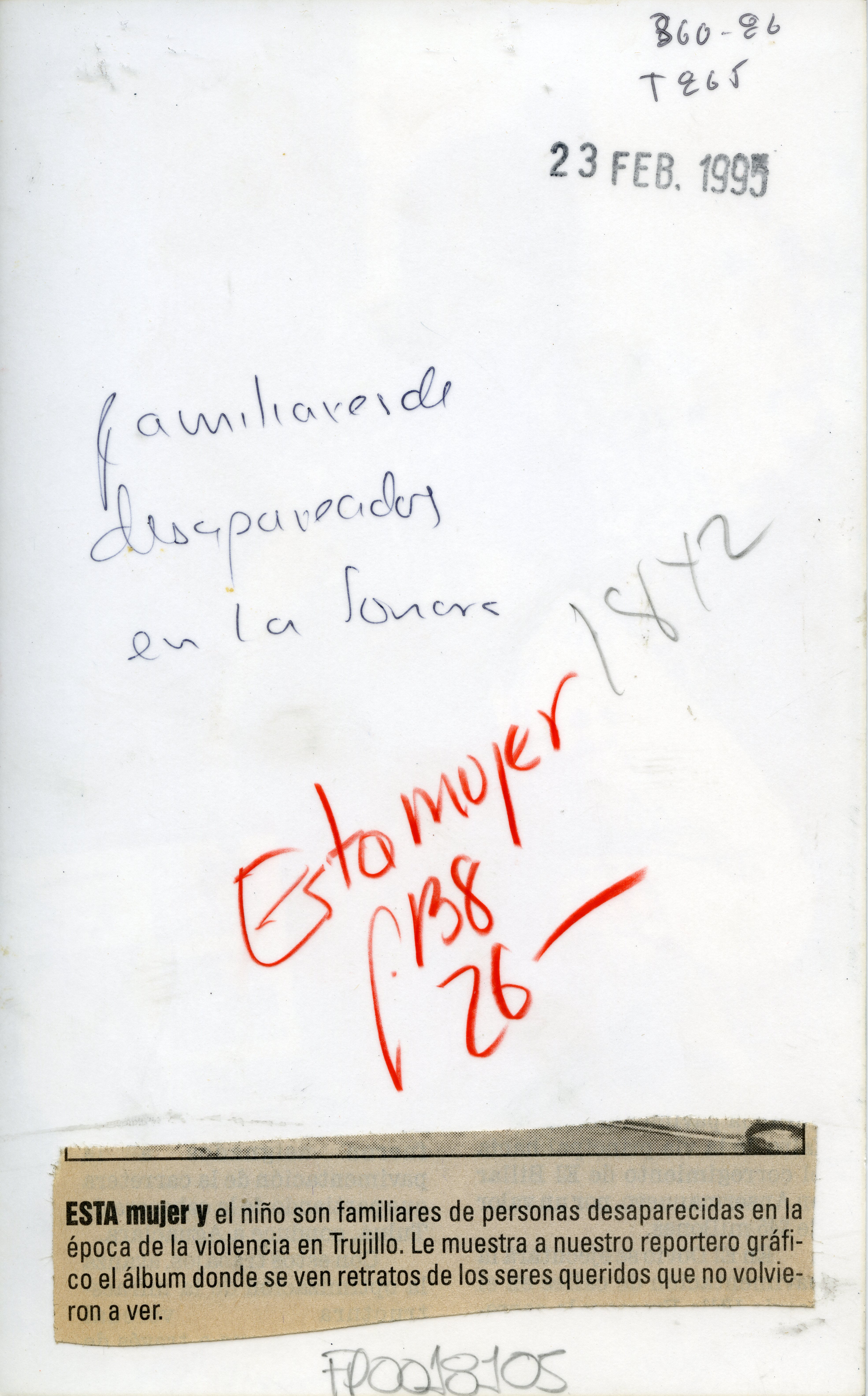Plano completo de una mujer y un niño, en el suelo un álbum fotográfico que enseñan. Atrás se observa una puerta y lo que parece la fachada de una casa. El recorte periodístico señala que son familiares de desaparecidos producto de la violencia en el corregimiento de La Sonora de Trujillo. Al reverso de la fotografía se anexa recorte "Esta mujer y el niño son familiares de personas desaparecidas en la época de la violencia en Trujillo. Le muestra a nuestro reportero gráfico el álbum donde se ven retratos de los seres queridos que no volvieron a ver."
