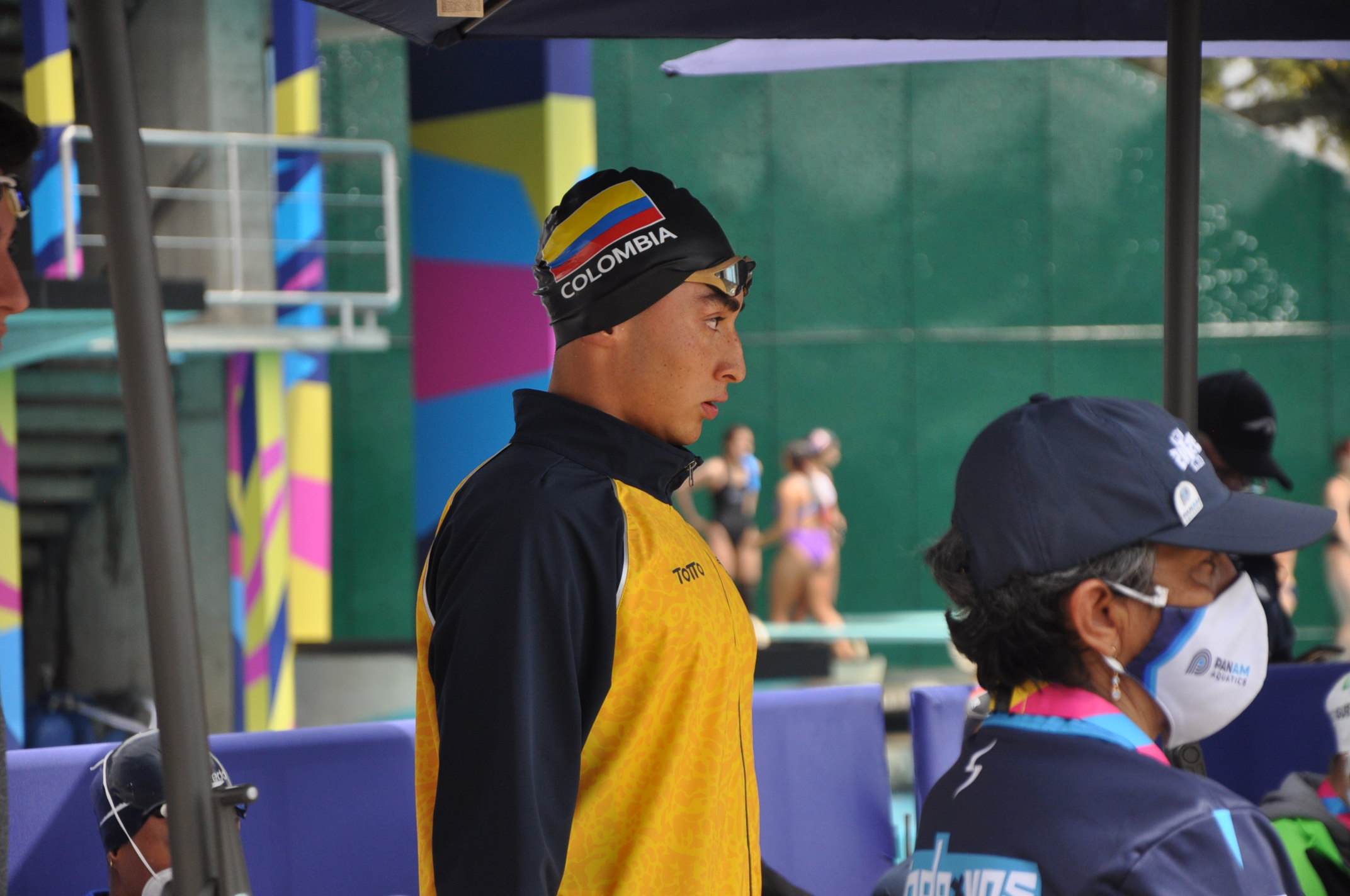 En el registro fotográfico podemos apreciar a uno de los colombianos participantes de la prueba de natación en los "I Juegos Panamericanos Junior" llevados a cabo en la ciudad de Cali.