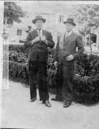 Señores con el traje de paño y el sombrero de fieltro negro característico del vestir masculino de la época. Zarzal, C. 1950