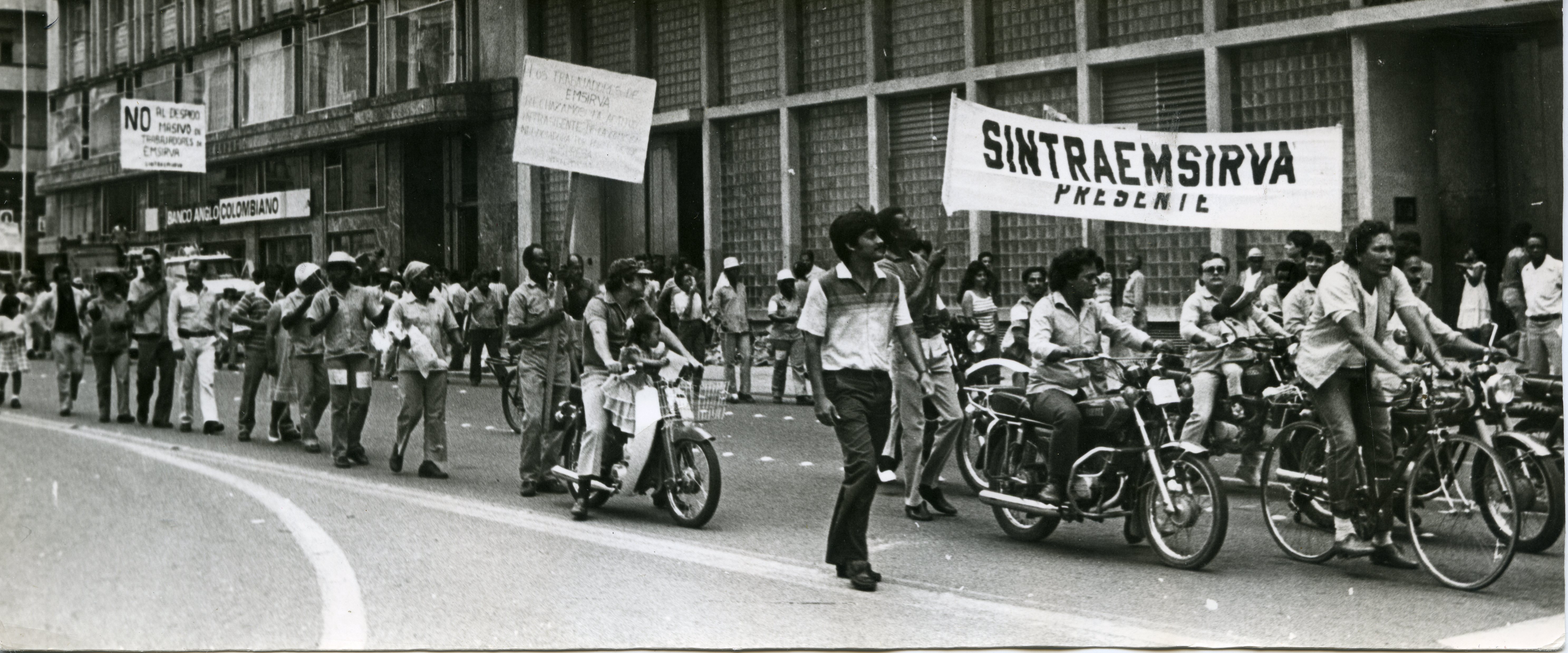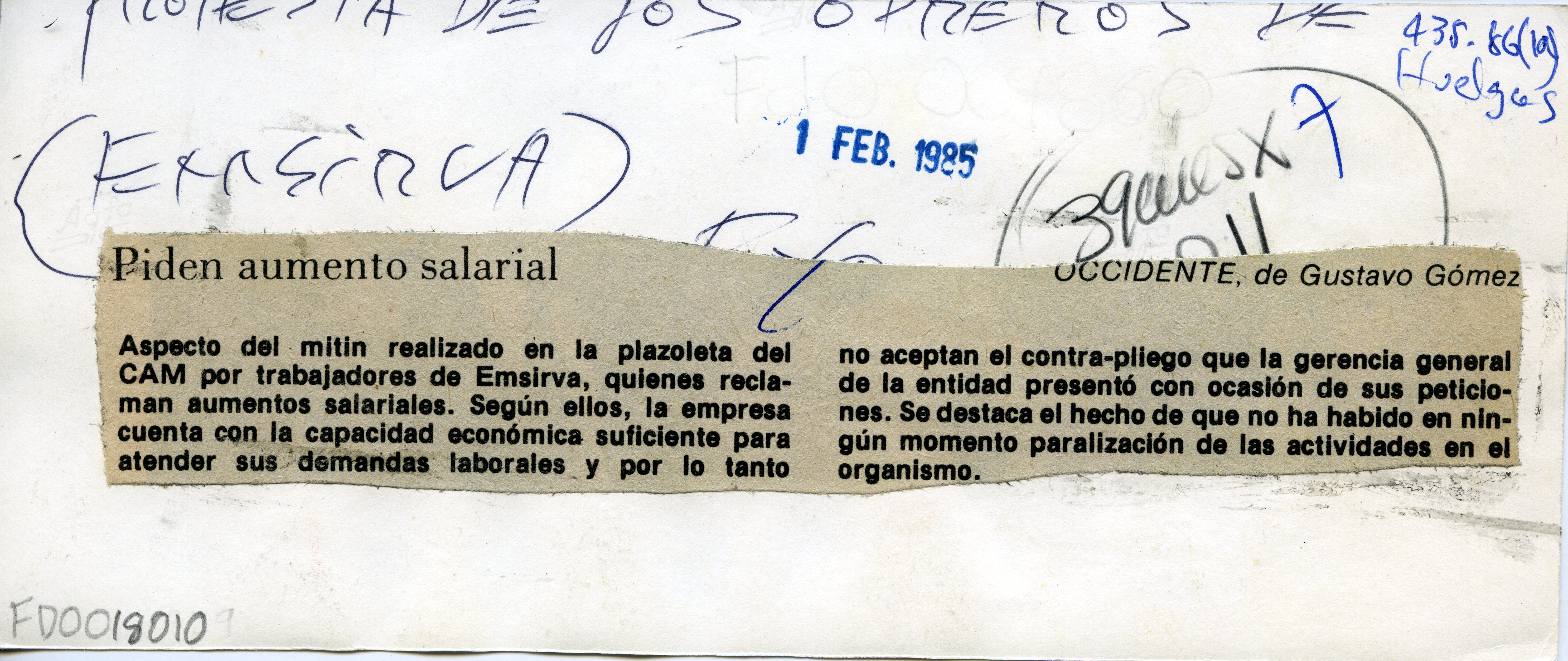 Al reverso de la fotografía se anexa recorte. "Aspecto del mitin realizado en la plazoleta del CAM por trabajadores de Emsirva, quienes reclaman aumentos salariales. Según ellos, la empresa cuenta con la capacidad económica suficiente para atender sus demandas laborales y por lo tanto no aceptan el contra-pliego que la gerencia general de la entidad presentó con ocasión de sus peticiones. Se destaca el hecho de que no ha habido en ningún momento paralización de las actividades del organismo."