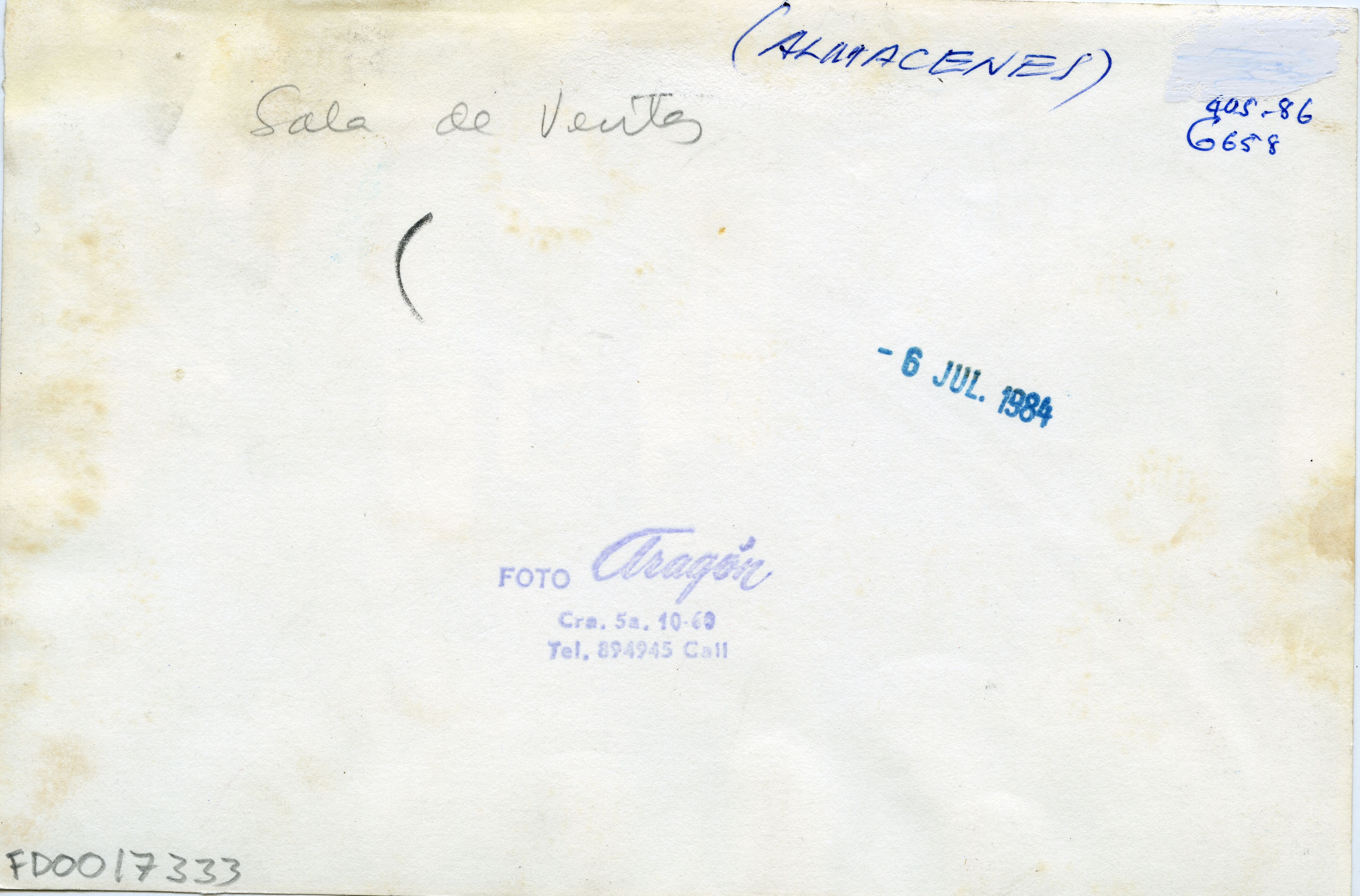 Serviteca Cañaveralejo. Nota en manuscrito reverso de la foto: Sala de ventas. Almacenes