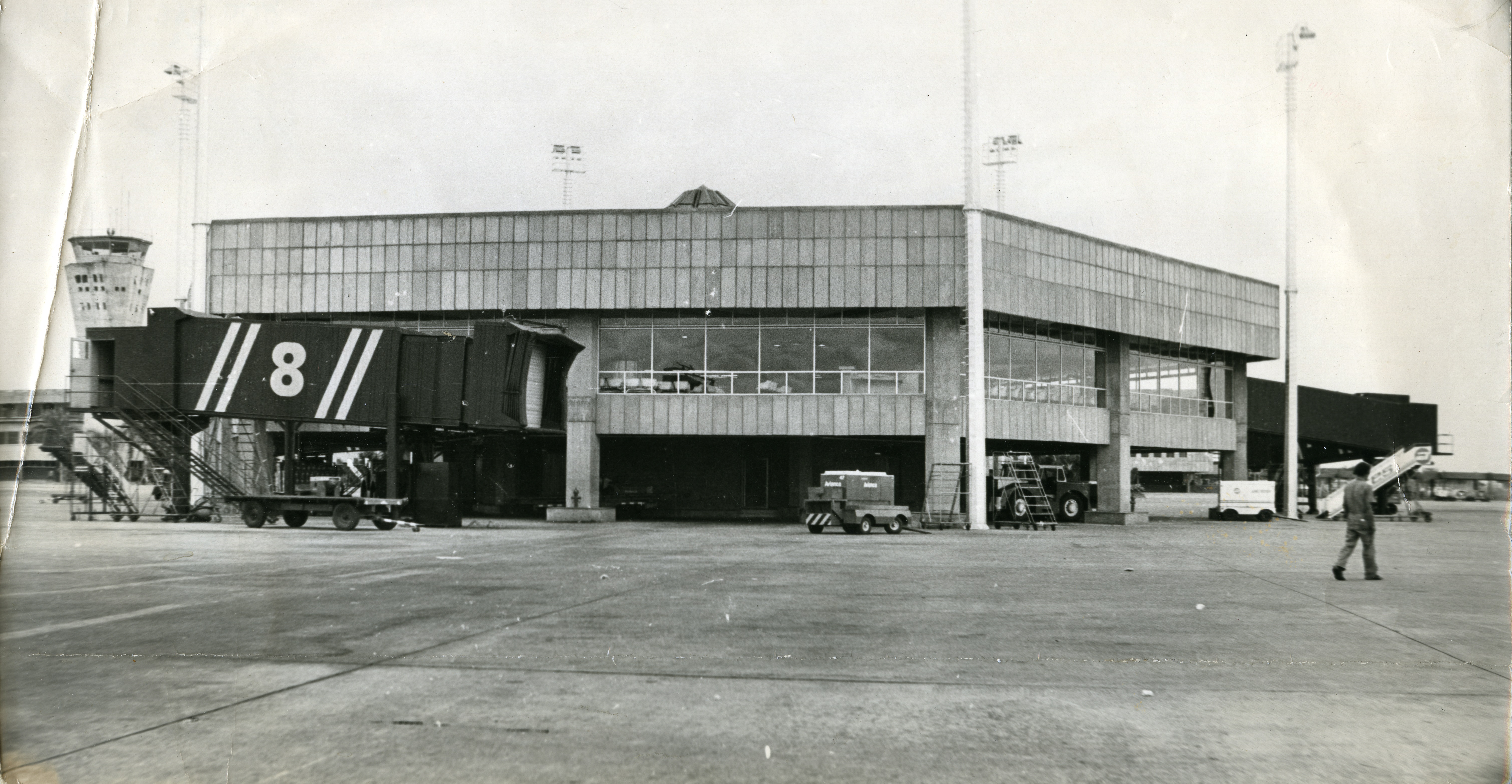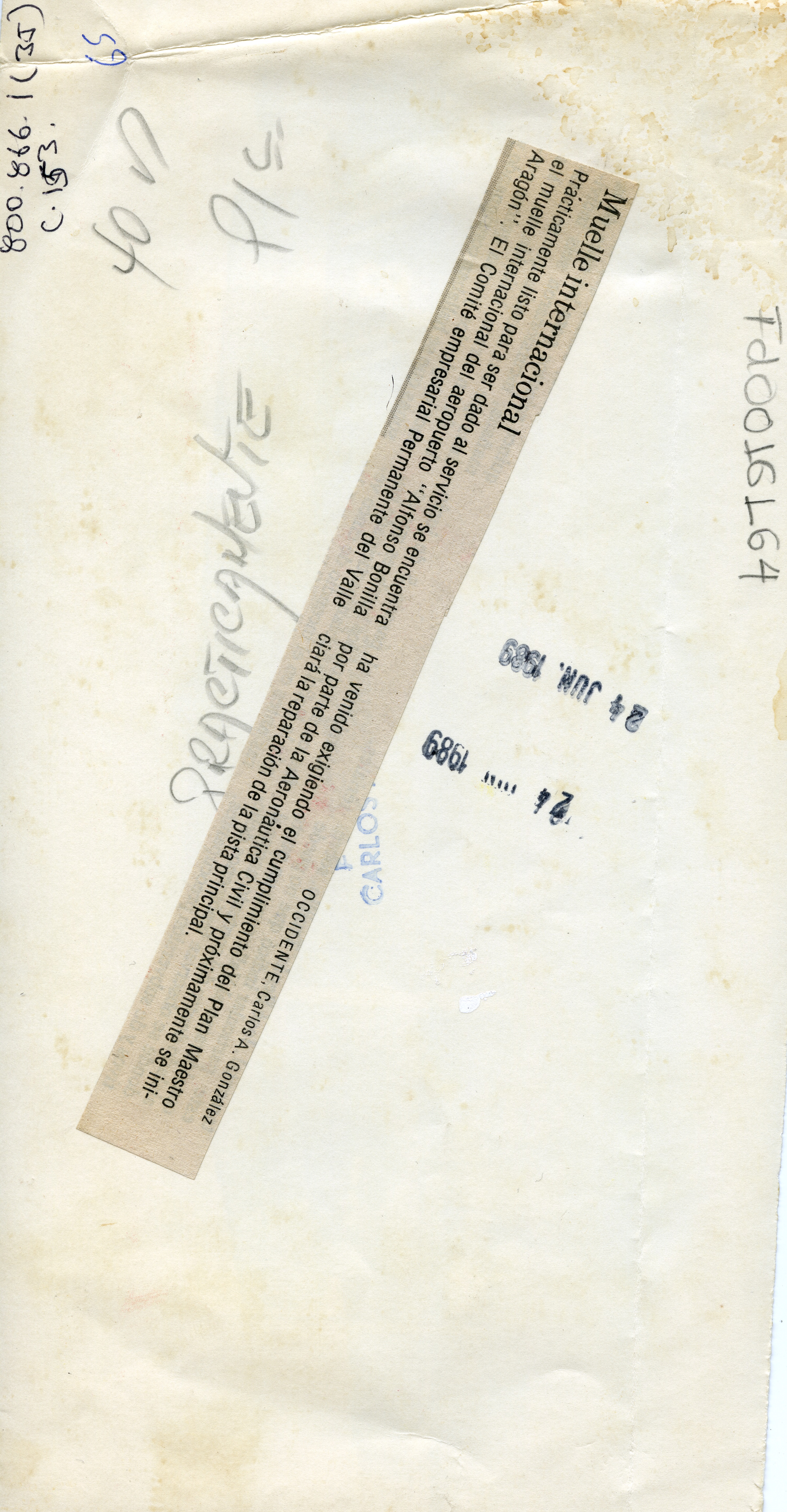 Al reverso de la fotografía se anexa recorte: "Muelle internacional. Prácticamente listo para ser dado al servicio se encuentra el muelle internacional del aeropuerto "Alfonso Bonilla Aragón". El comité empresarial permanente del Valle ha venido exigiendo el cumplimiento del Plan Maestro por parte de la Aeronáutica Civil y próximamente se iniciará la reparación de la pista principal"