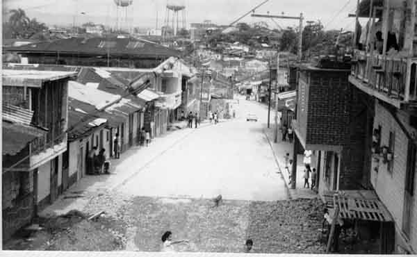 Calle 1ª, principal de Buenaventura. Avenida más próxima al mar que sube al barrio Pueblo Nuevo y baja al barrio Viento Libre. Buenaventura, C.1950.