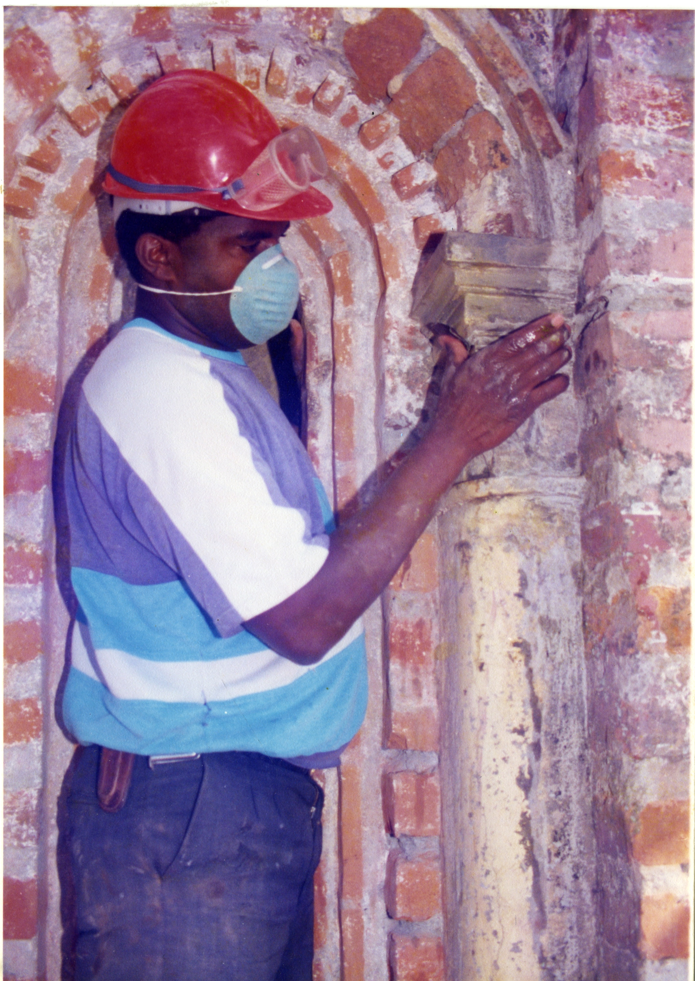 Restaurador arquitectónico con indumentaria correspondiente trabajando en la Catedral Nuestra Señora el Rosario del Palmar en Palmira.