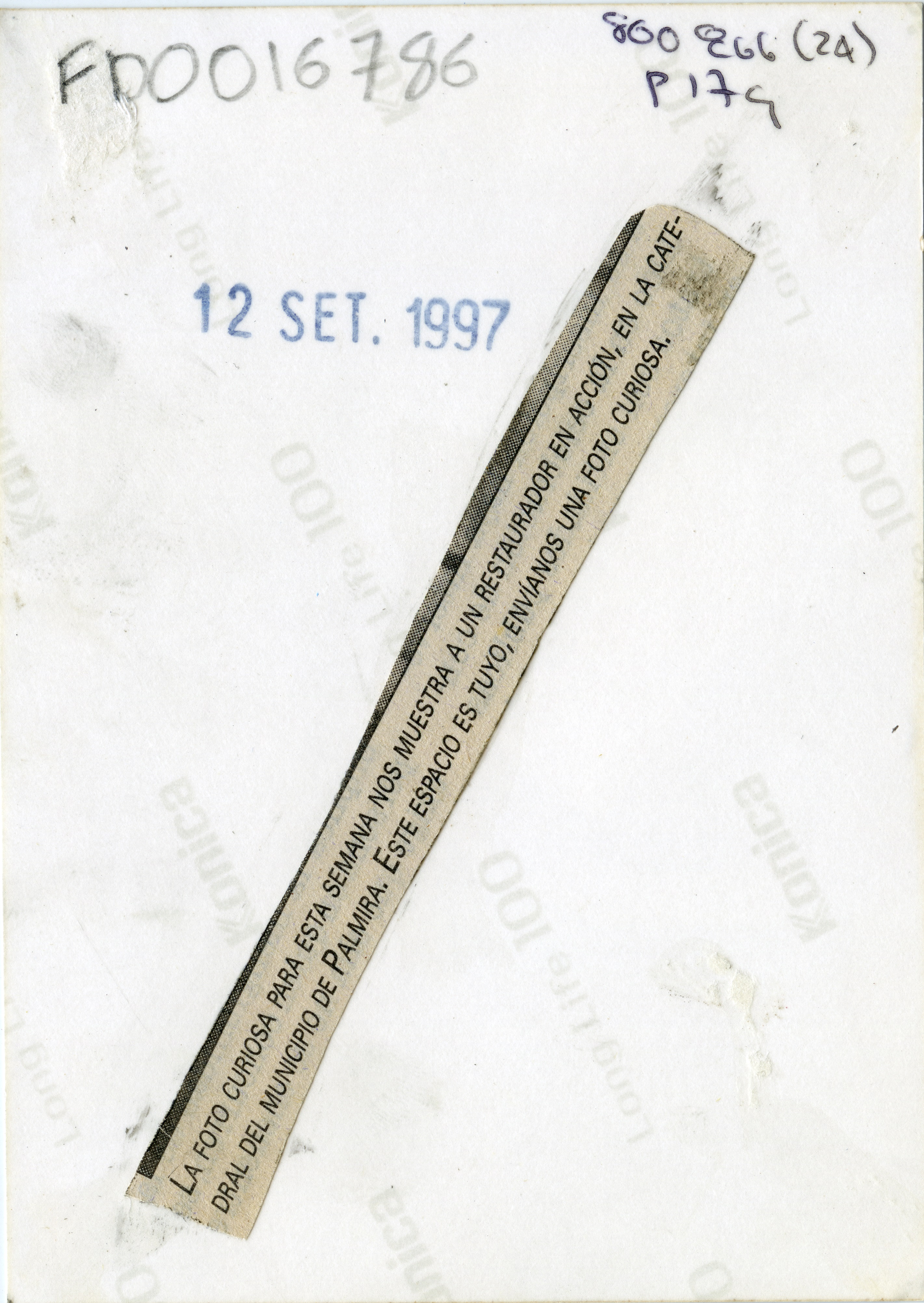 Al reverso de la fotografía se anexa recorte: La foto curiosa para esta semana nos muestra a un restaurador en acción, en la catedral del municipio de Palmira. Este espacio es tuyo, envíanos una foto curiosa."