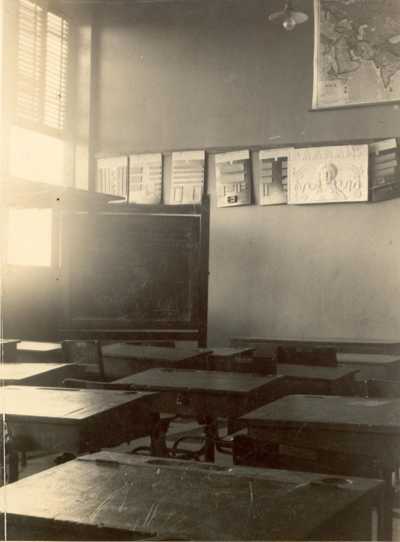 Instituto Educativo Técnico Industrial Antonio José Camacho, saLón de clase. Esta institución se creo por Acuerdo Municipal No 25 de 1933, que ordeno construir una escuela de formación técnico-práctica, para dar respuesta a la necesidad de mano de obra capacitada, requerida por el crecimiento industrial y urbano de la ciudad. Santiago de Cali, fecha aproximada, 1936.