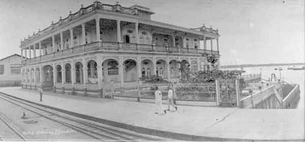 Estación del Ferrocarril, construcción de estilo republicano. El ferrocarril del Pacífico era la obra modernizadora más importante que se perfilaba en el Valle del Cauca. Buenaventura, 1928.