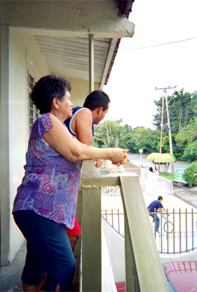 Familia del autor en balcón de su residencia. Exterior día. Plano general.