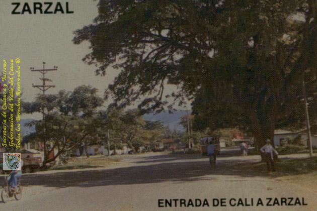La fotografía tiene dos textos escritos a máquina, uno en el ángulo superior izquierdo que dice "Zarzal", y otro en pa parte inferior derecha que dice "Entrada de Cali a Zarzal".