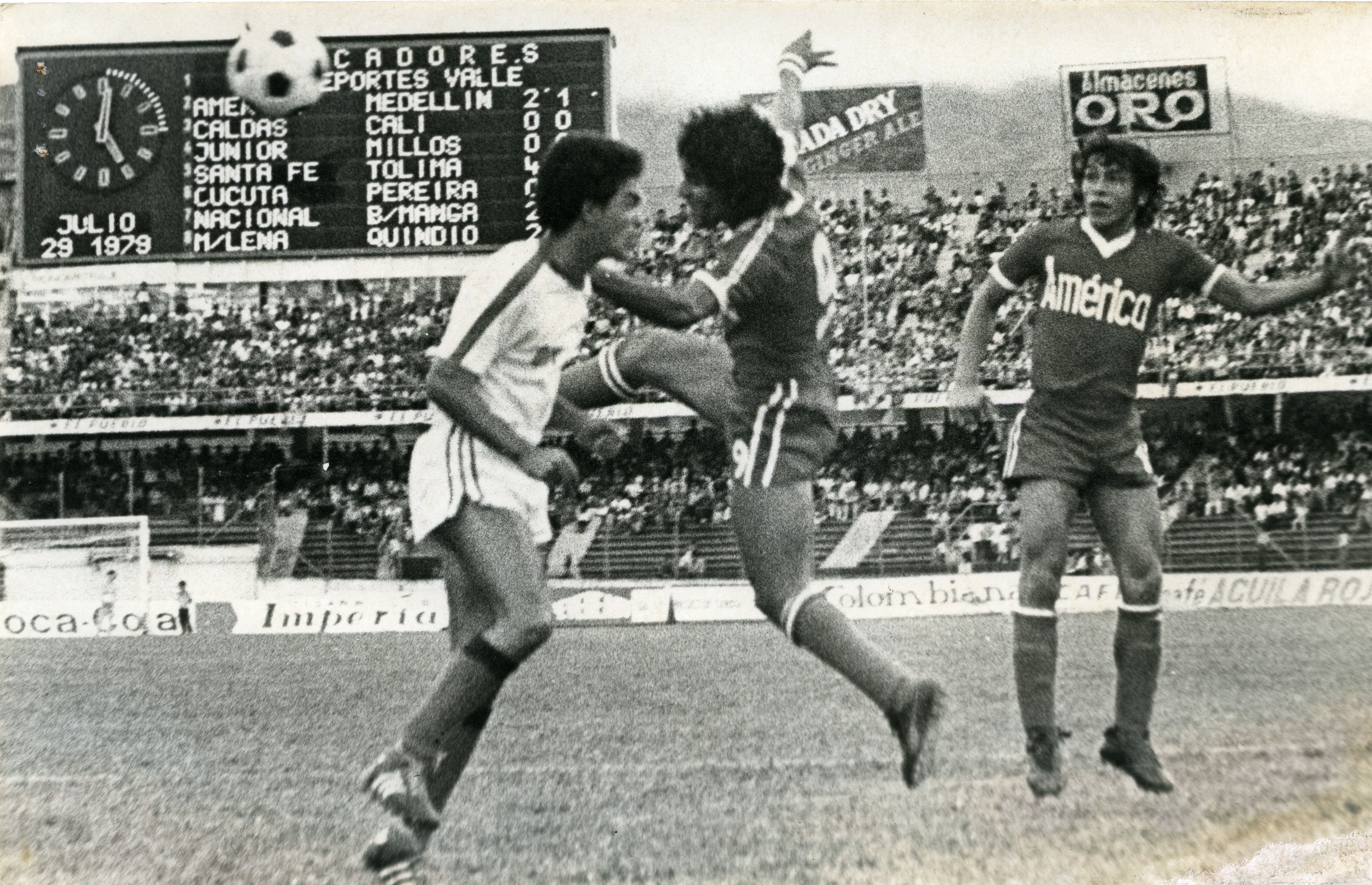 En la gráfica escena del partido realizado en el estadio Olímpico Pascual Guerrero entre los equipos América y Medellín. Se aprecia a Cáceres disputa balón con jugador del Medellín. Observamos a Congote en escena de la jugada