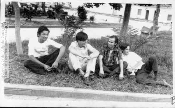 Otoniel Arana, Pedro Liva, César Gómez y Mario Arana, "Parqueando" una práctica cultural muy afincada en las gentes de nuestros pueblos ya que el parque es un espacio de encuentro social y de recreación. Parque Santander en Zarzal. 1975.