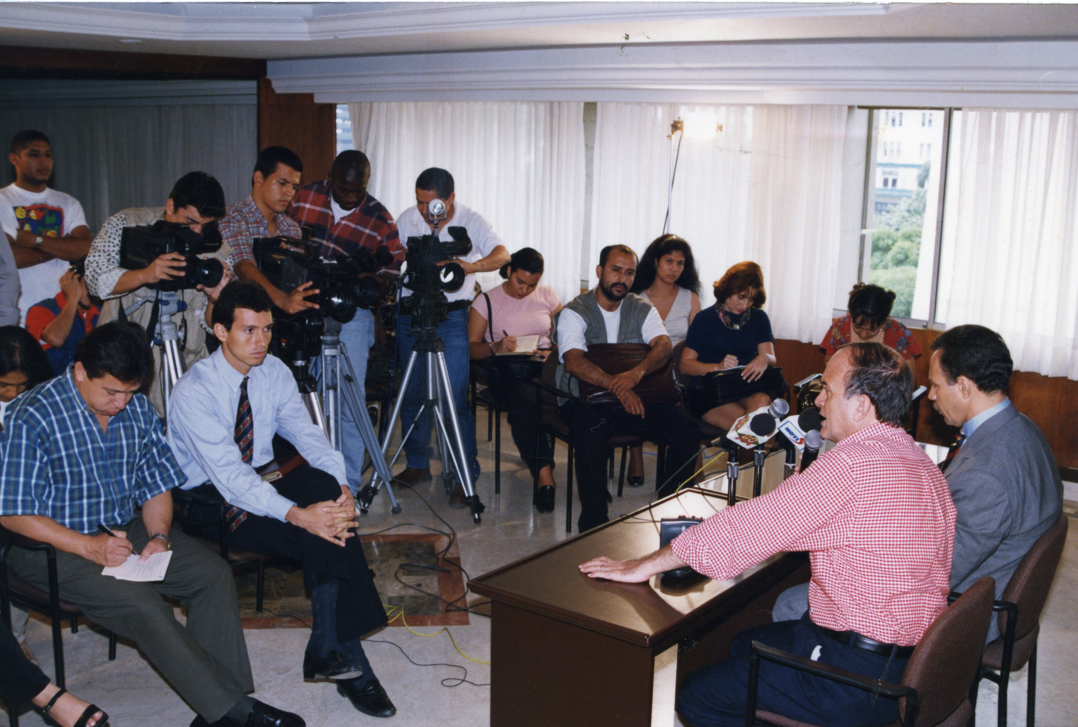Se observa periodistas colombianos en una conferencia, se puede apreciar varios medios de comunicaion, como 90 minutos y noti 5 y entre otros medios.