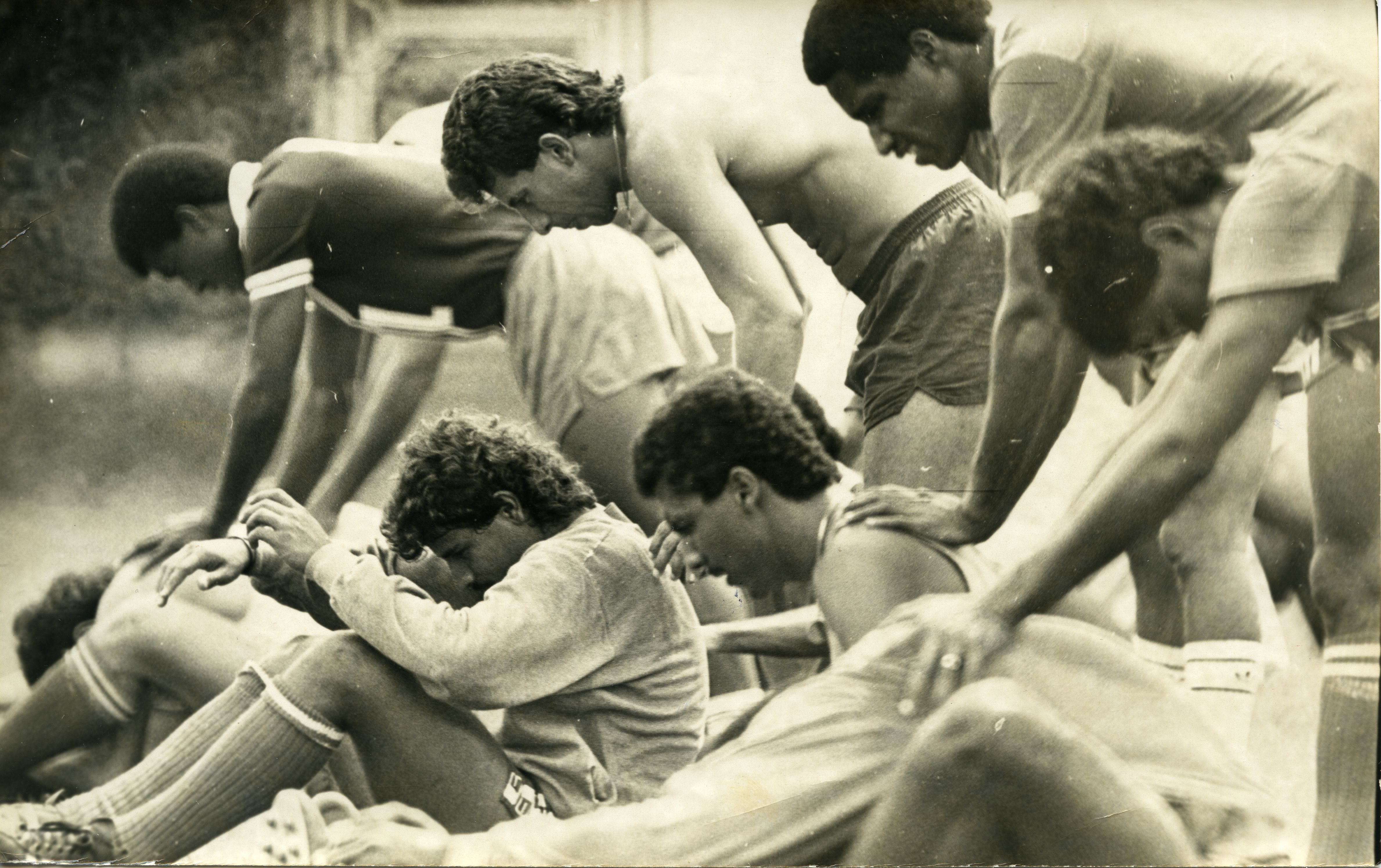 Se aprecia en la foto una sesión de estiramientos de un equipo de futbol, 6 personas en cuadro.