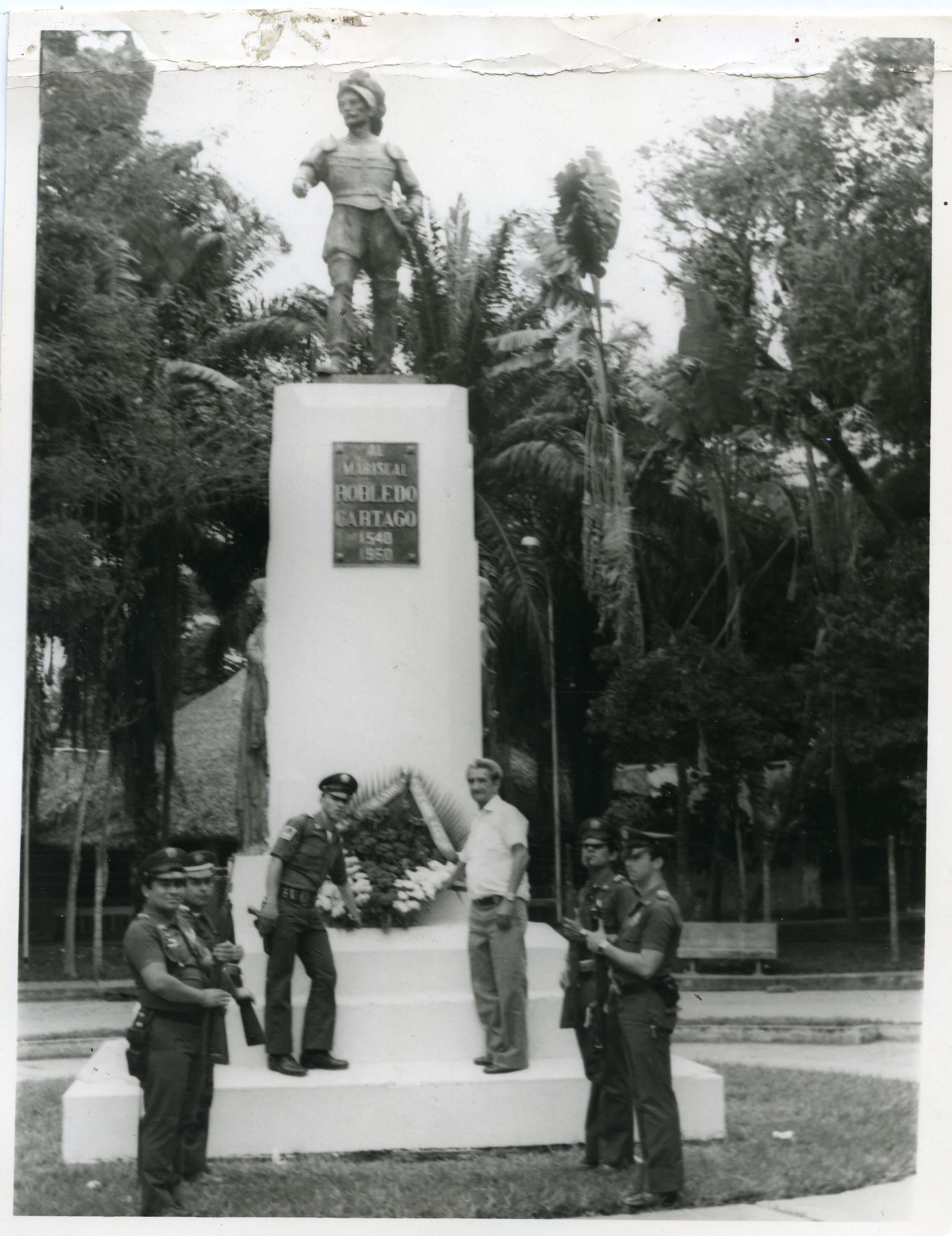 En el pie de foto dice lo siguiente: el alcalde de Obando, Holmes Vélez, coloca una ofrenda floral ante la estatua del Mariscal Jorge Robledo, durante los actos de conmemoración de los 444 años de fundación de Cartago. Aparecen igualmente el comandante de la Policía de Obando y varios agentes de esta institución.