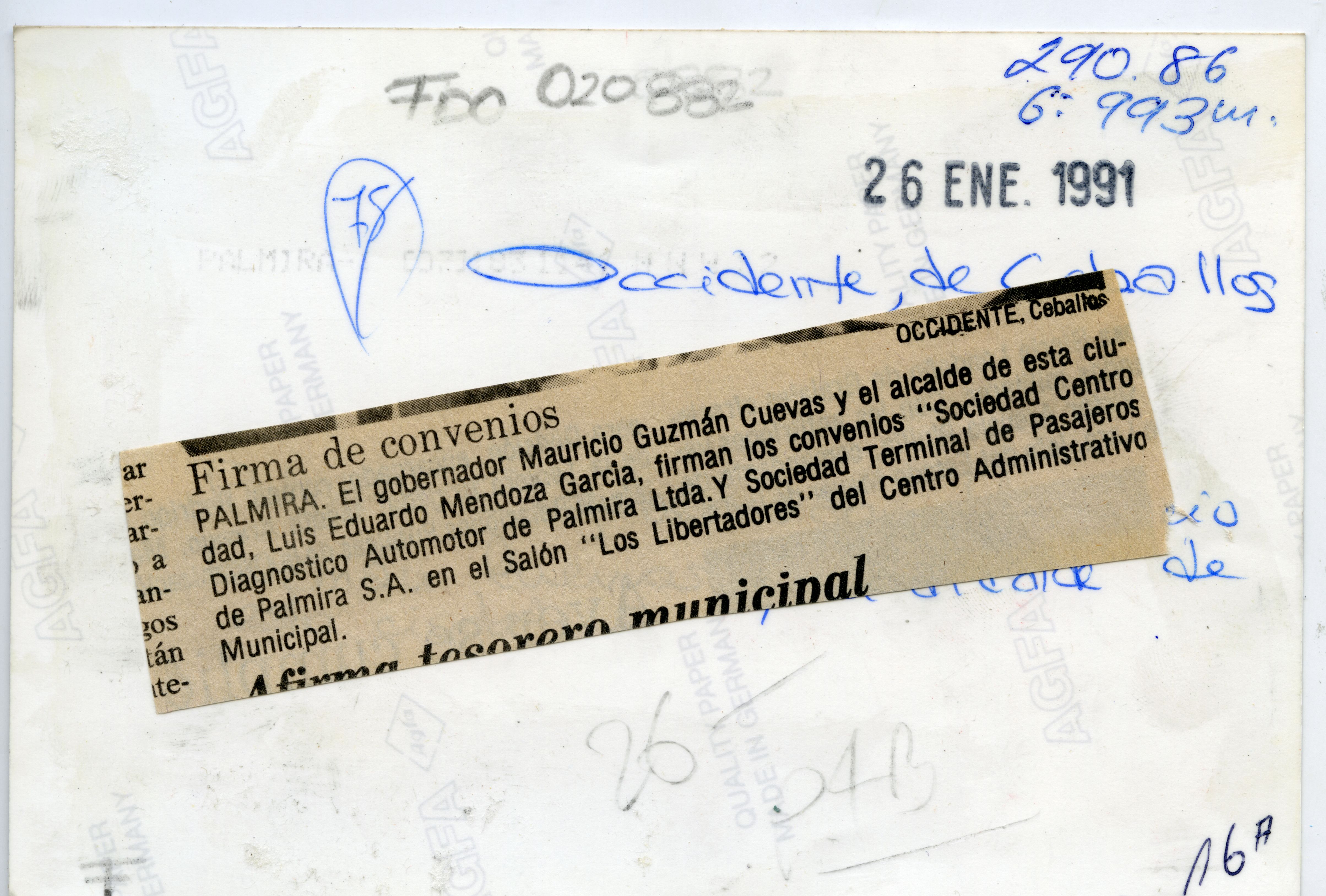 Reverso: Palmira.El gobernador Mauricio Guzmán Cuevas, y el alcalde de esta ciudad, Luis Eduardo Mendoza García, firman los convenios " Sociedad Centro Diagnostico Automotor de Palmira Ltda. Y Sociedad Terminal de Pasajeros de Palmira S.A. en el Salón " del Centro Administrativo Municipal