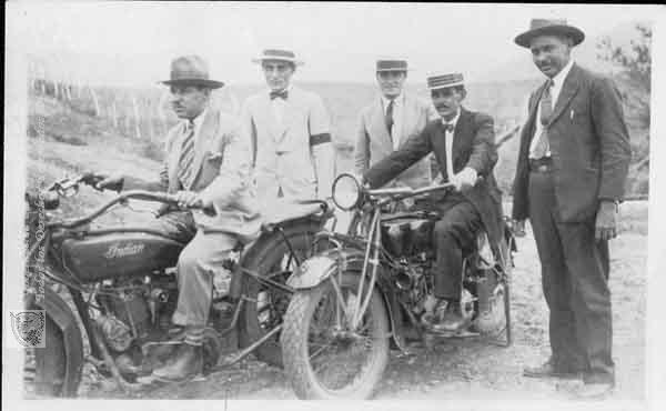 Motociclistas, nótese los trajes de los motociclistas quienes aún en la competencia, no perdían elegancia