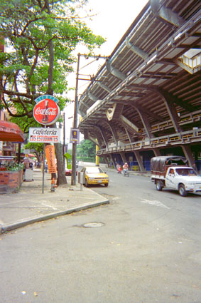 Imagen tomada en exterior, donde se puede apreciar la fachada occidental del estadio Pascual Guerrero. Junto a este una vía por la que transitan algunos vehículos. Al extremo izquierdo algunos locales comerciales.