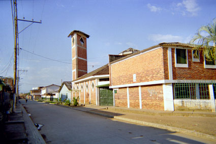 Plano general. Imagen tomada en exterior, donde se destaca la fachada de la parroquia, Nuestra Señora de Aguablanca en Manuela, sobre sus muros se refleja la luz del sol resaltando el color naranja del ladrillo.