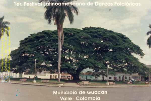 Postal del Parque central de Guacarí con el desaparecido samán al cual se le rinde homenaje en las actuales monedas de 500 pesos. Al fondo a la izquierda la casa cural uno de las edificiaciones coloniales más antiguas del valle del Cauca. C. 1990