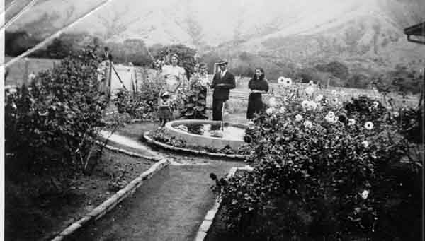 Justina Rojas de Delgado dando un paseo por los jardines de la hacienda San Miguel, en compañía de los dueños de ésta