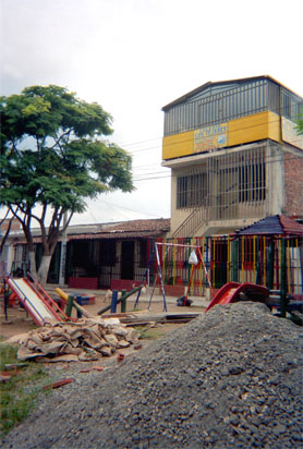 Plano medio. Exterior día. Sobresale casa de tres niveles, con profusión de líneas. Vivacidad de colores y formas en franja central. Montículo de arena en primer plano como punto sobresaliente.