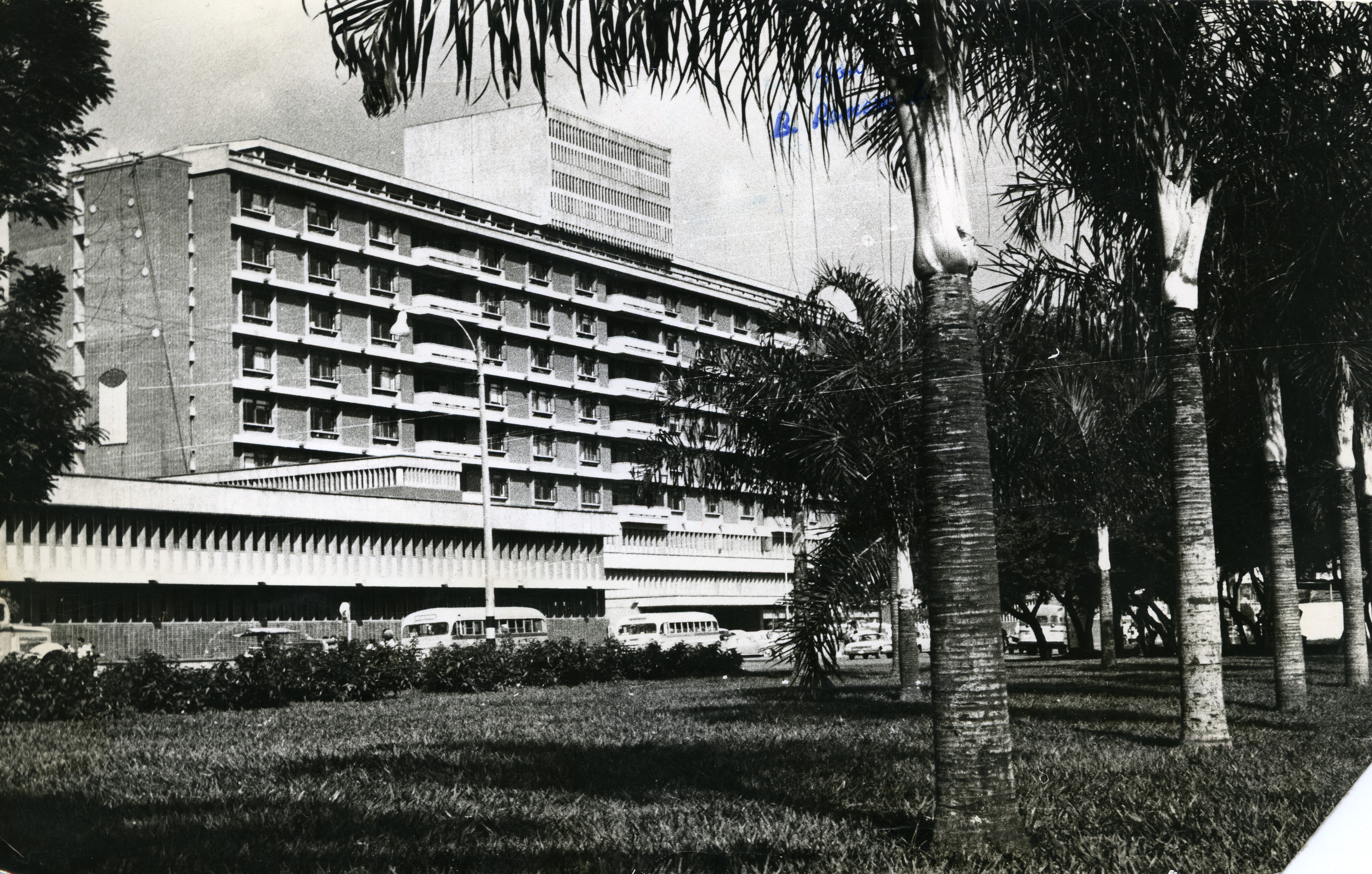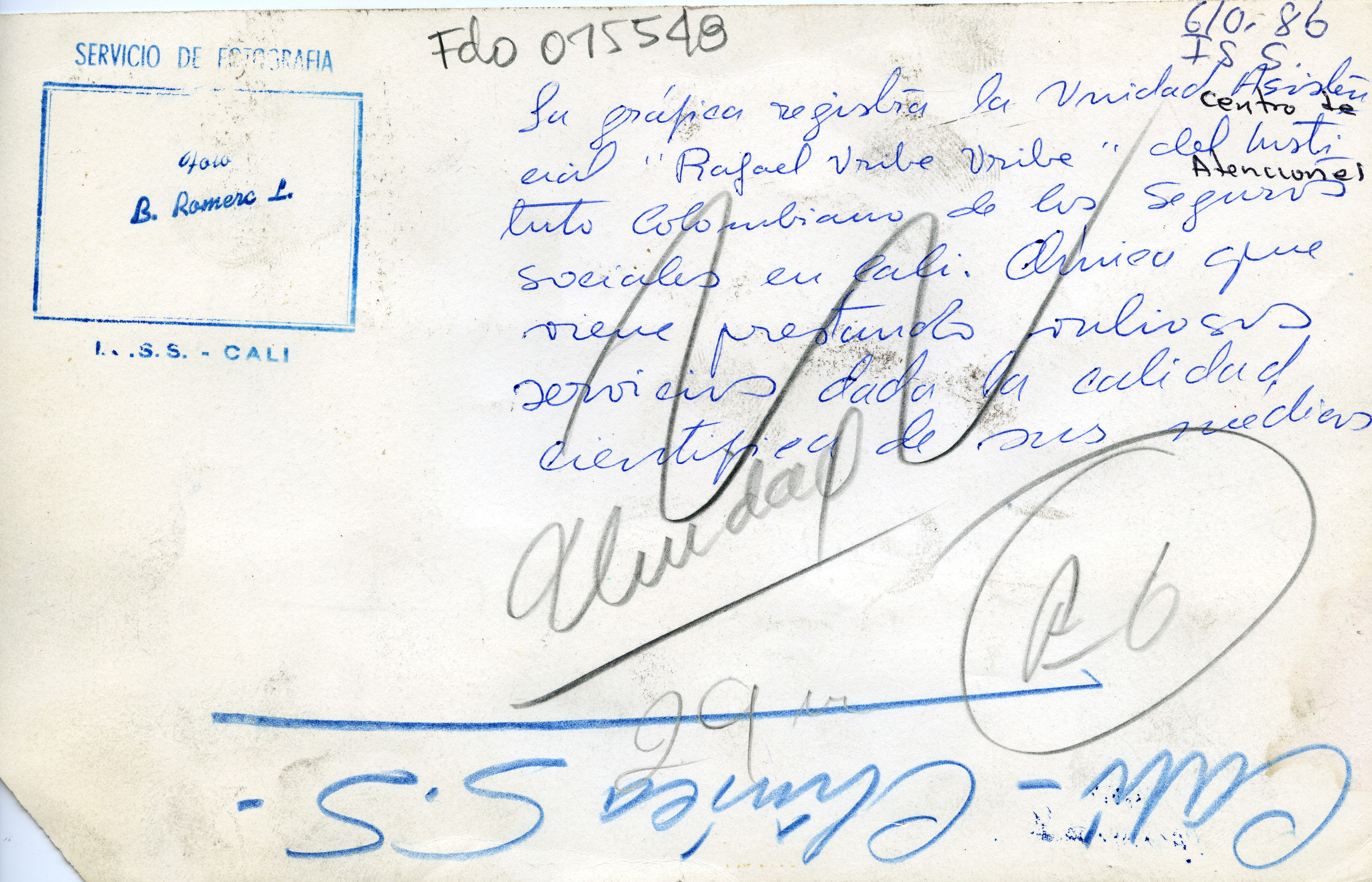 Al reverso de la fotografía dice: " La Gráfica registra la Unidad Asistencial "Rafael Uribe Uribe" del Instituto Colombiano de los Seguros Sociales en Cali. Clínica que viene prestando valiosos servicios dada la calidad científica de sus médicos"