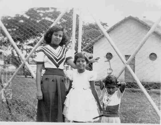 Lida Varela, Lucy y David Arias, en la entrada a la escuela. Cartago, 1.958