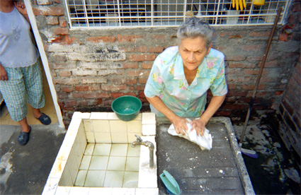 Plano medio. Toma en picado. Doña Gilma anciana ciega lavando ropa. Al lado izquierdo parte del cuerpo de una mujer. Pared en ladrillo.
