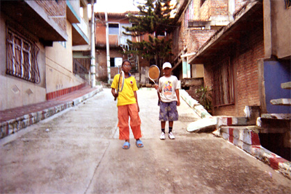 Plano medio. Exterior día. Niños en la calle. En el campo visual las construcciones ocupan mayor lugar, en tanto que los niños se destacan por el colorido de su indumentaria y su evidente puesta en escena.