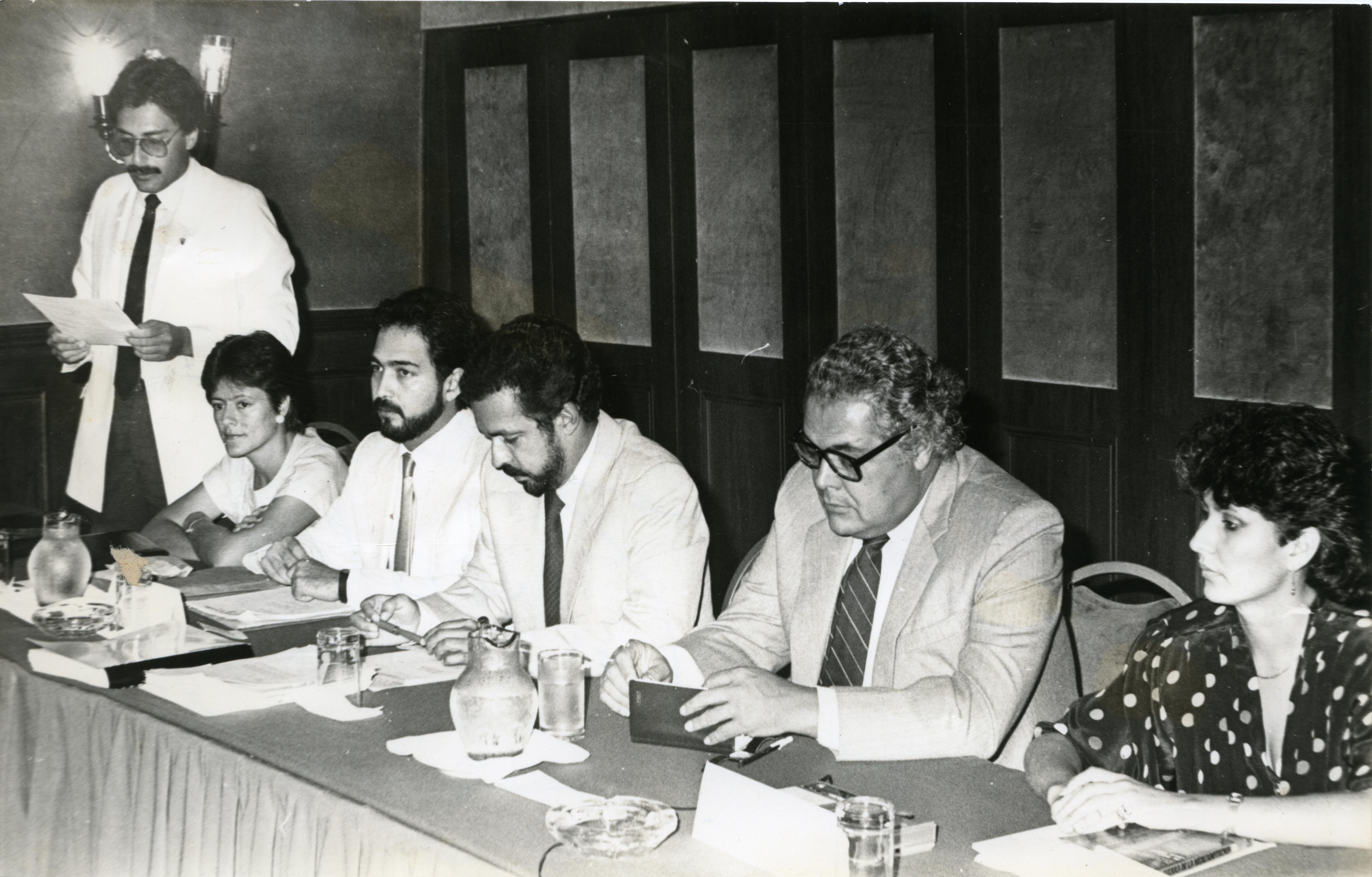 En la gráfica el exministro Rodrigo Escobar Navia, presidio la Asamblea General de Cámara Junior de Cali, acto cumplido en el hotel Intercontinental con los socios del capítulo. Le acompañan en la mesa directiva, Carlos Algarra, Luz Stella Giménez, Erie Casanova, Humberto López y Nubia Gaona, miembros de la Cámara Junior