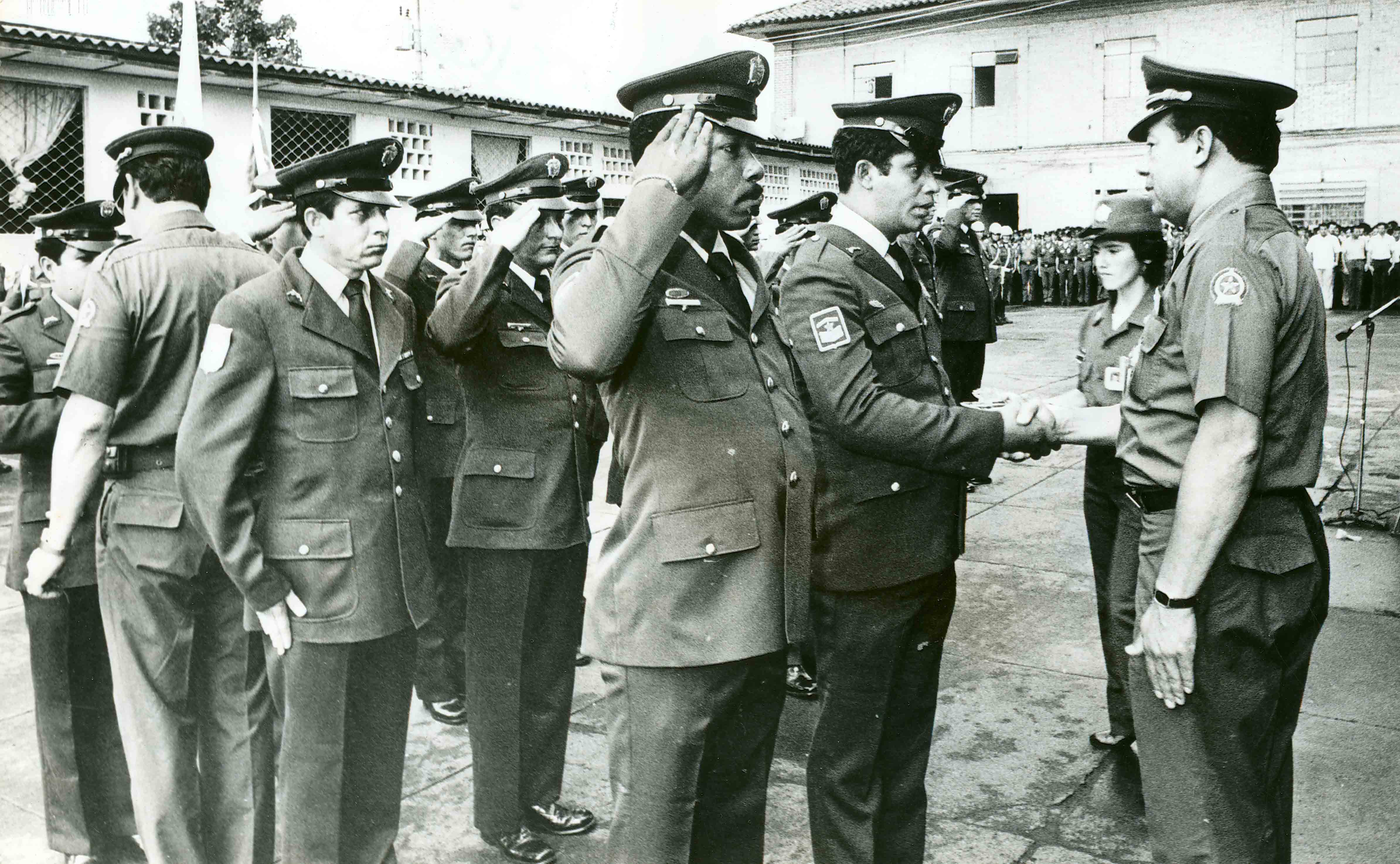 Por disposción de la dirección general de la policía, varios suboficiales de la institución pertenecientes al departamento Valle fueron ascendidos. Las jinetas respectivas fueron impuestas, en sobria ceremonia cumplida en el cuartel general del citado cuerpo armado por el comandante Oswaldo Caraballo Díaz. En la fotografía se aprecia el momento en que uno de los ascendidos es felicitado por el coronel Caraballo. El Archivo del Patrimonio Fotográfico y Fílmico del Valle del Cauca es responsabilidad de la Biblioteca Departamental del Valle Jorge Garcés Borrero, por convenio de cooperación suscrito con la Secretaria del Cultura Departamental, con el fin de aunar esfuerzos para su conservación, preservación y divulgación del Archivo entre la comunidad Vallecaucana, especialmente entre los estudiantes e investigadores que visitan la Biblioteca, propiciando el su uso y consulta permanente. La universidad Icesi es un colaborador en el proceso de difusión, facilitando la tecnología que permite la consulta de las imágenes.