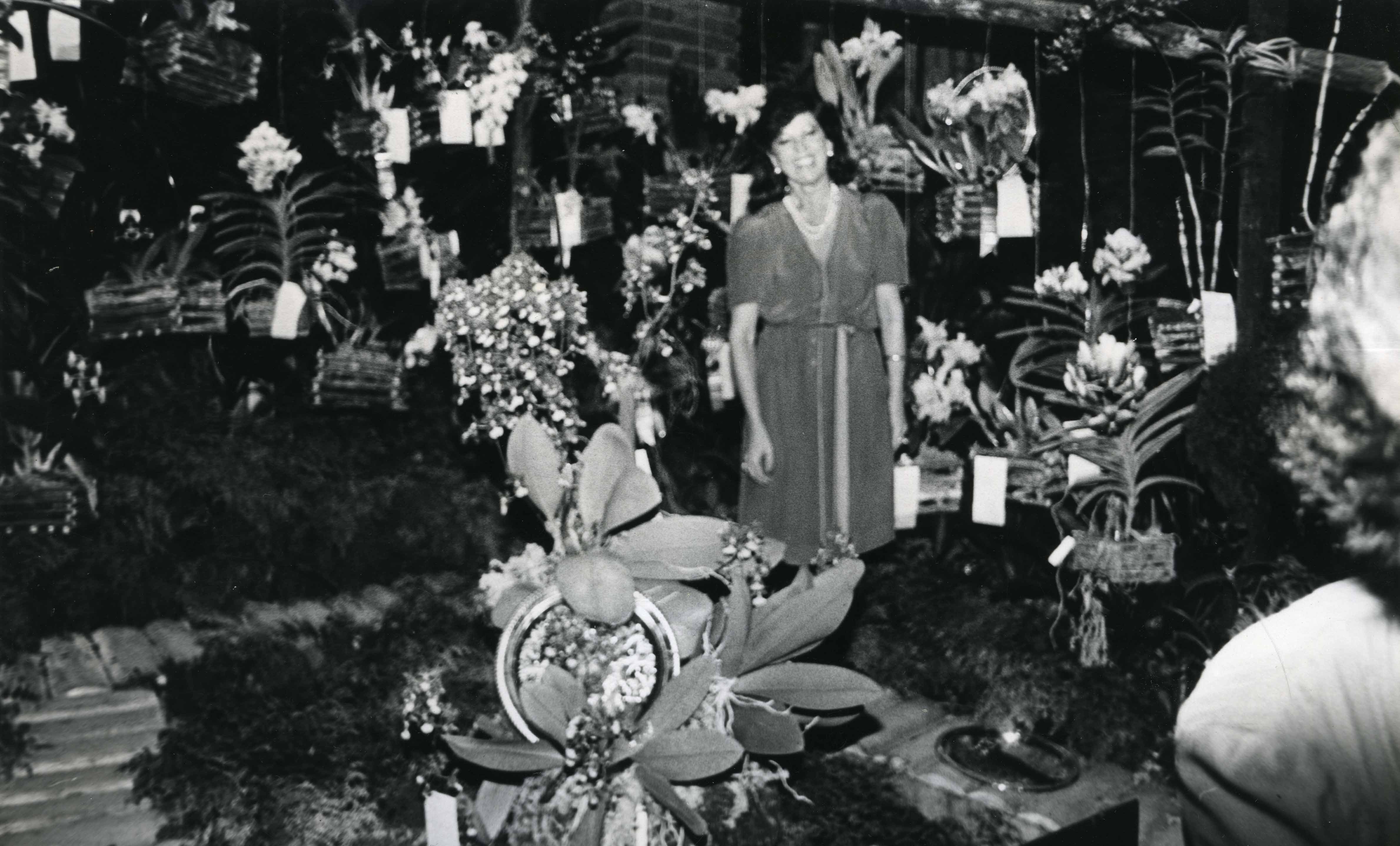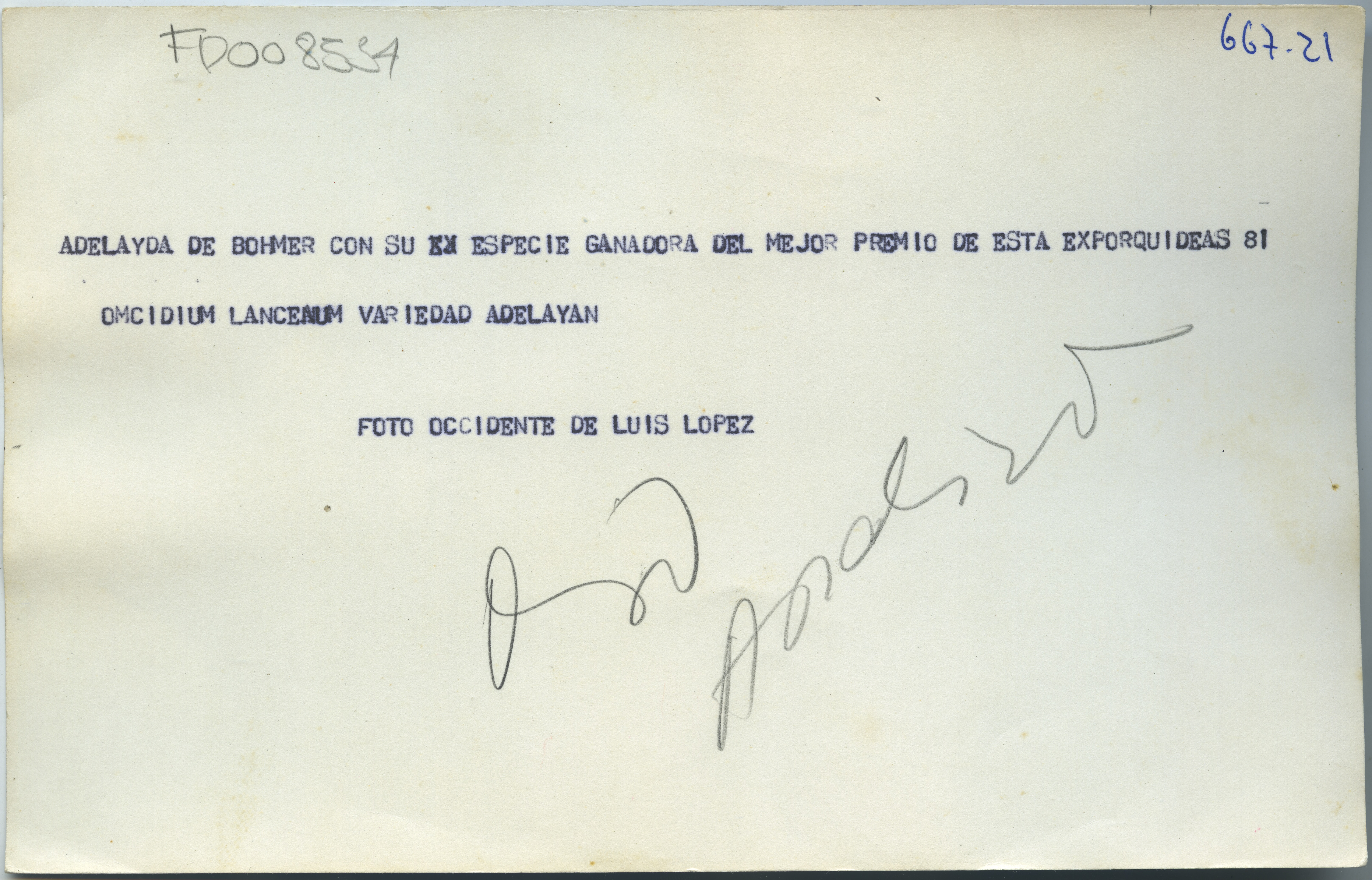 Al reverso de la fotografía se anexa nota mecanografiada: "Adelayda de Bohmer con su especie ganadora del mejor premio de esta Exporquideas 81. Omcidium lanceaum variedad adelayan."
