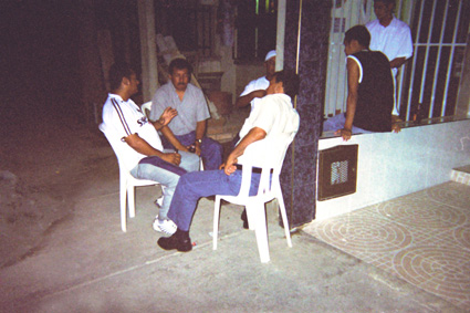 Plano Medio. Imagen tomada en exterior, de noche con luz de flash. En la imagen se destaca un grupo de hombres sentados en el muro de entrada a una vivienda.