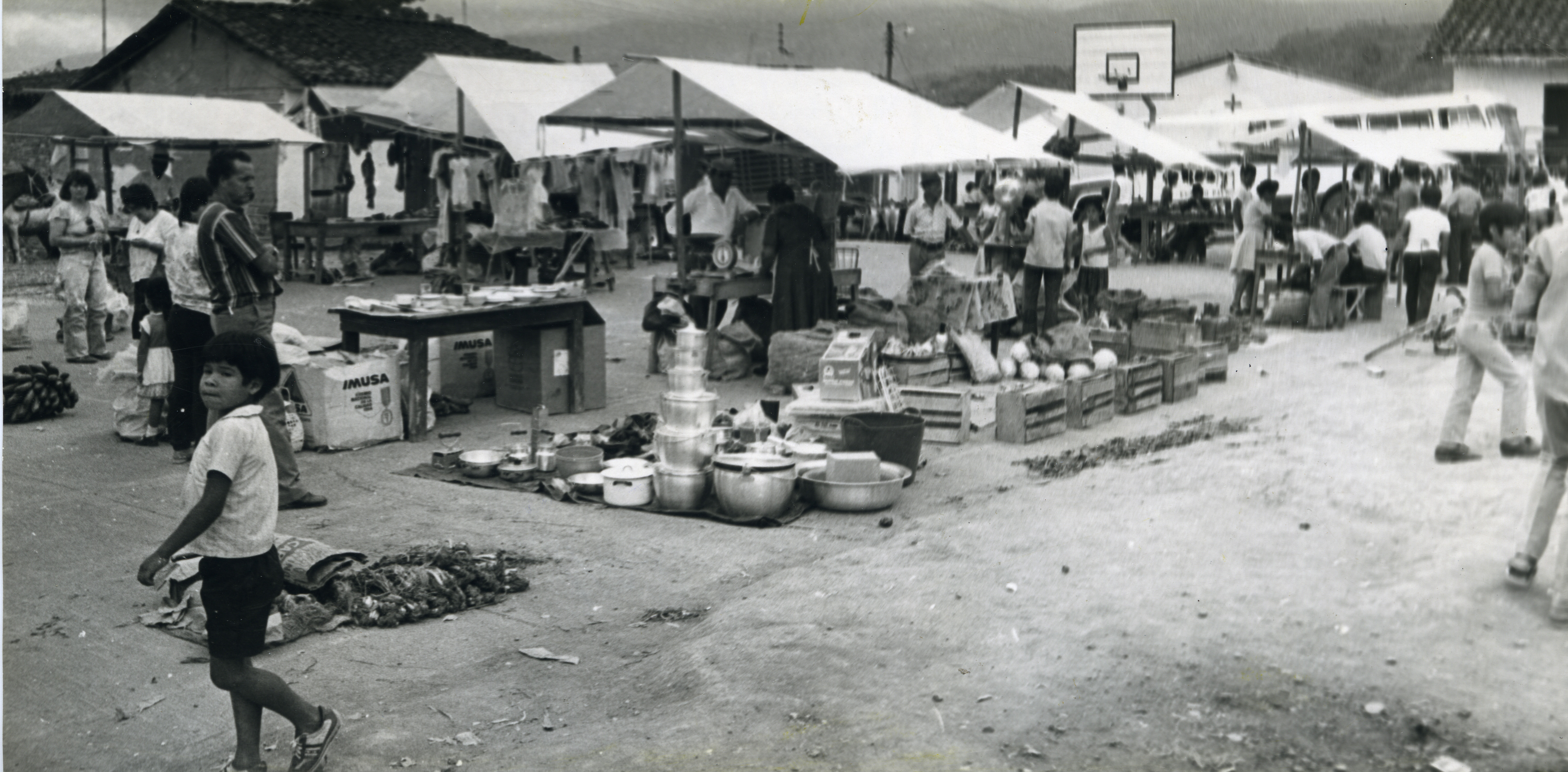 Al reverso de la fotografía dice: Piden galerías. Villacolombia. Los moradores de esta región, vienen pidiendo desde hace algún tiempo, la pronta construcción de la galería, ya que allí convergen campesinos de diferentes veredas que llegan con el fin de vender sus productos. La gráfica muestra cómo la plaza central sirve de local para vender los productos del agro.