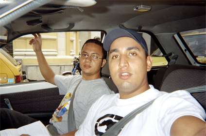 El autor y un acompañante en el interior de un vehículo. Primer plano. Imagen tomada con flash.