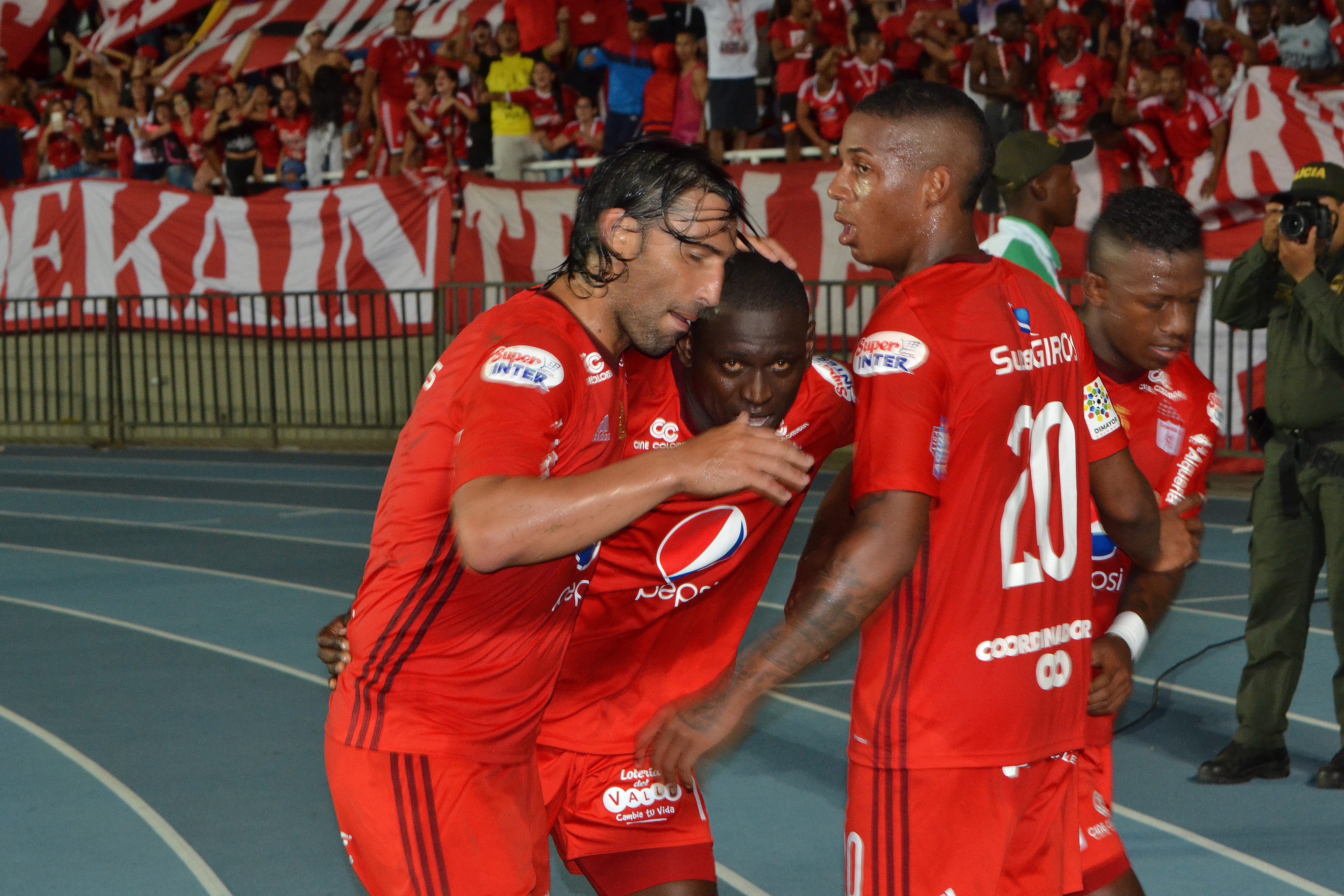 Se aprecia a Cristián Martínez Borja y Ernesto "Tecla" Farías en celebración por gol anotado para el equipo América de Cali