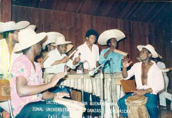 Encuentro Zonal Universitario de Danzas Folclóricas. Se puede apreciar la marimba, instrumento de origen africano. Cali, 1987.