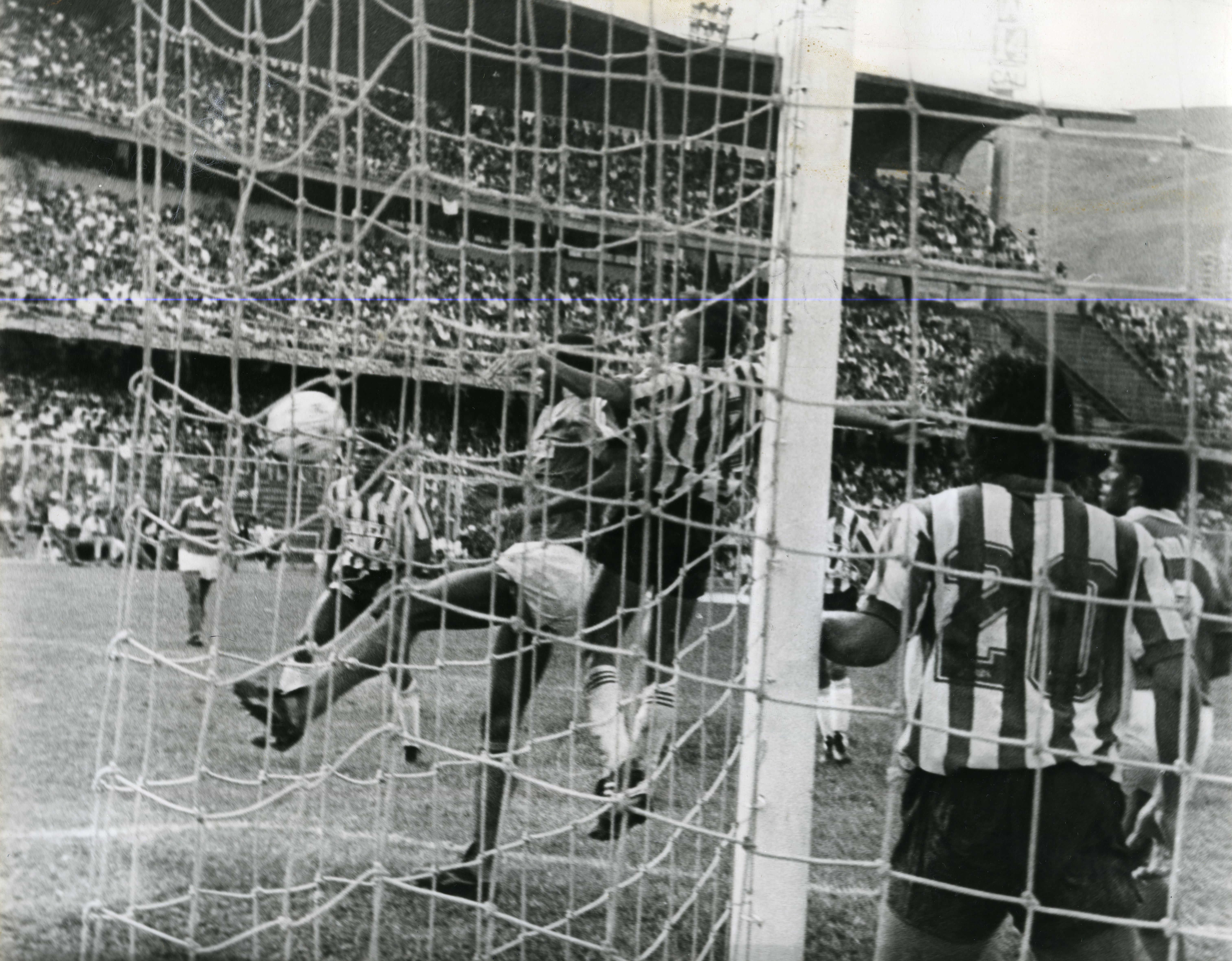 Partido del Deportivo Cali y Junior, realizado en el Estadio Olímpico Pascual Guerrero. Se aprecia el balón el área del Junior