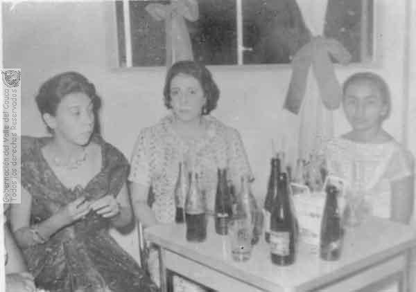 Nhora Valencia, Blanca Padilla y Ester Sol Mejía, tomando unas cervezas y gaseosa durante una fiesta. Era tradicional el consumo de gaseosa y no tanto de licor por parte de la mujer en las reuniones sociales. Caicedonia. 1960
