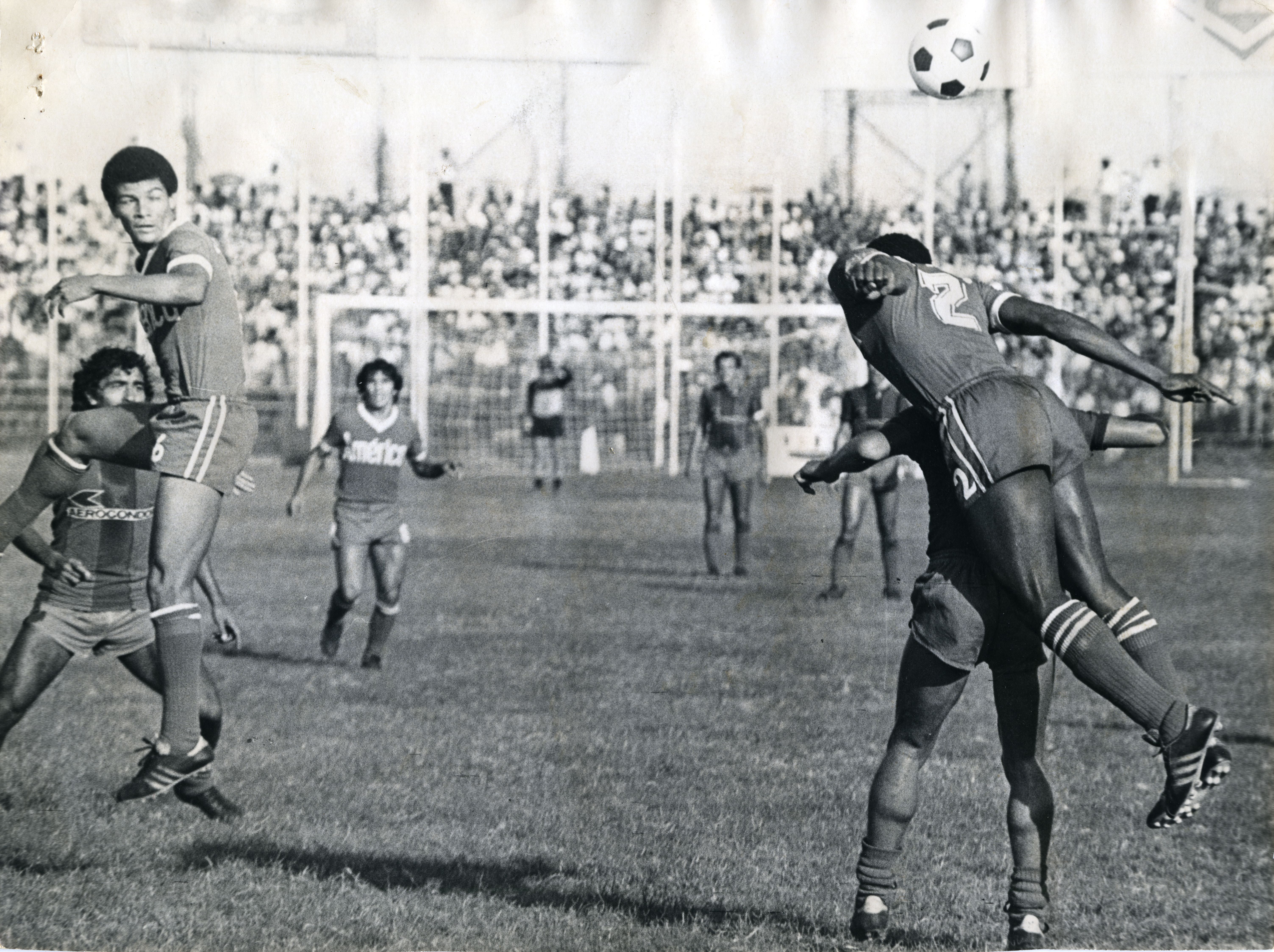 América de Cali, equipo de fútbol de la ciudad de Santiago de Cali, Valle del Cauca. Fue fundado oficialmente en el año 1927. América de Cali y Magdalena en partido realizado en el estadio Eduardo Santos. Se aprecia en la imagen al jugador Reyes disputa balón por lo alto. Observamos Público en la tribuna