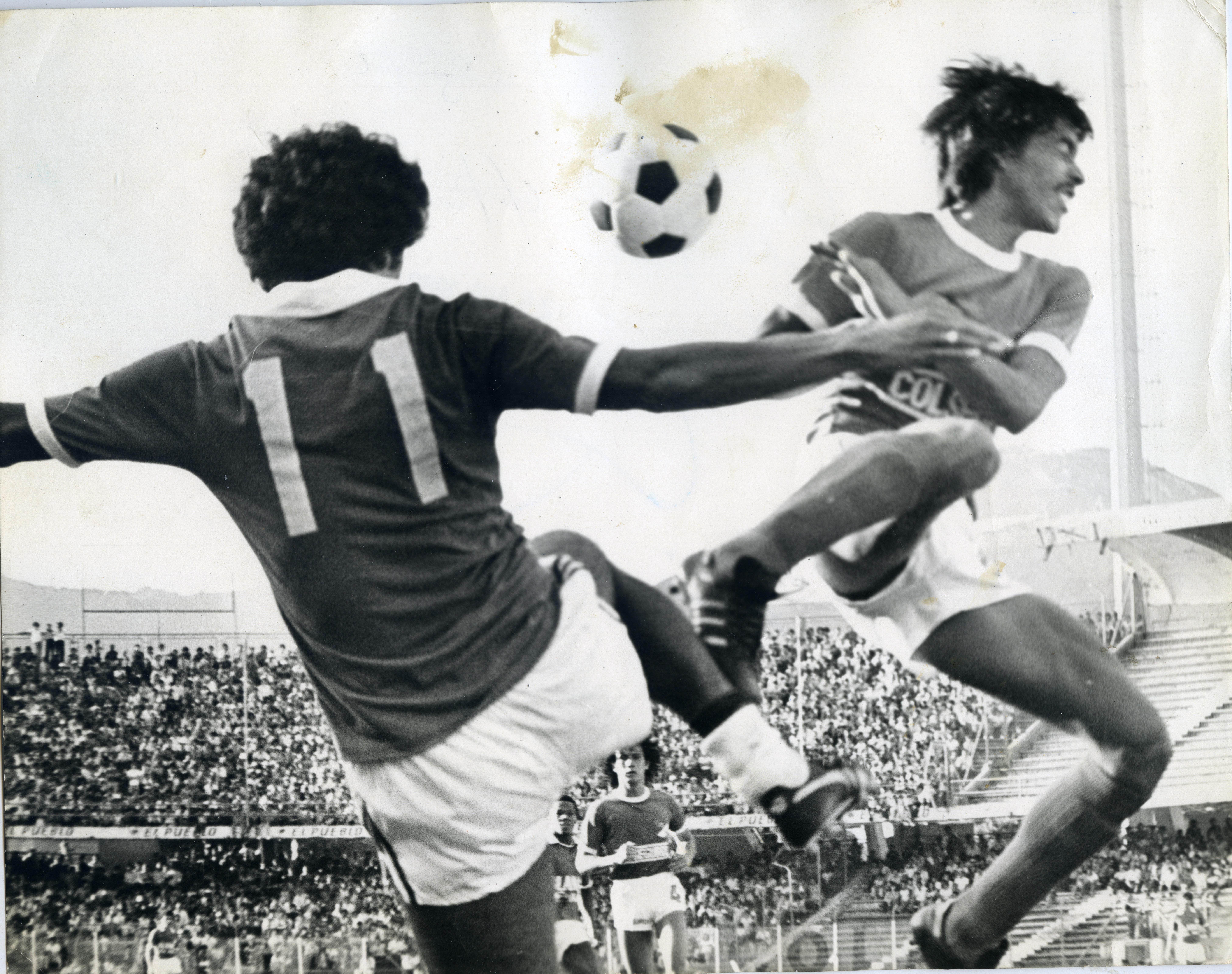 Dos jugadores en primer plano, uno del Deportivo Cali, con el número 11 en su camiseta el otro jugador es del Millonarios; estos dos jugadores están disputando el balón el cual está en el aire; al fondo se observa parte de la tribuna