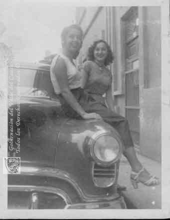 Olga Victoria y una amiga, posando en el automóvil de la familia